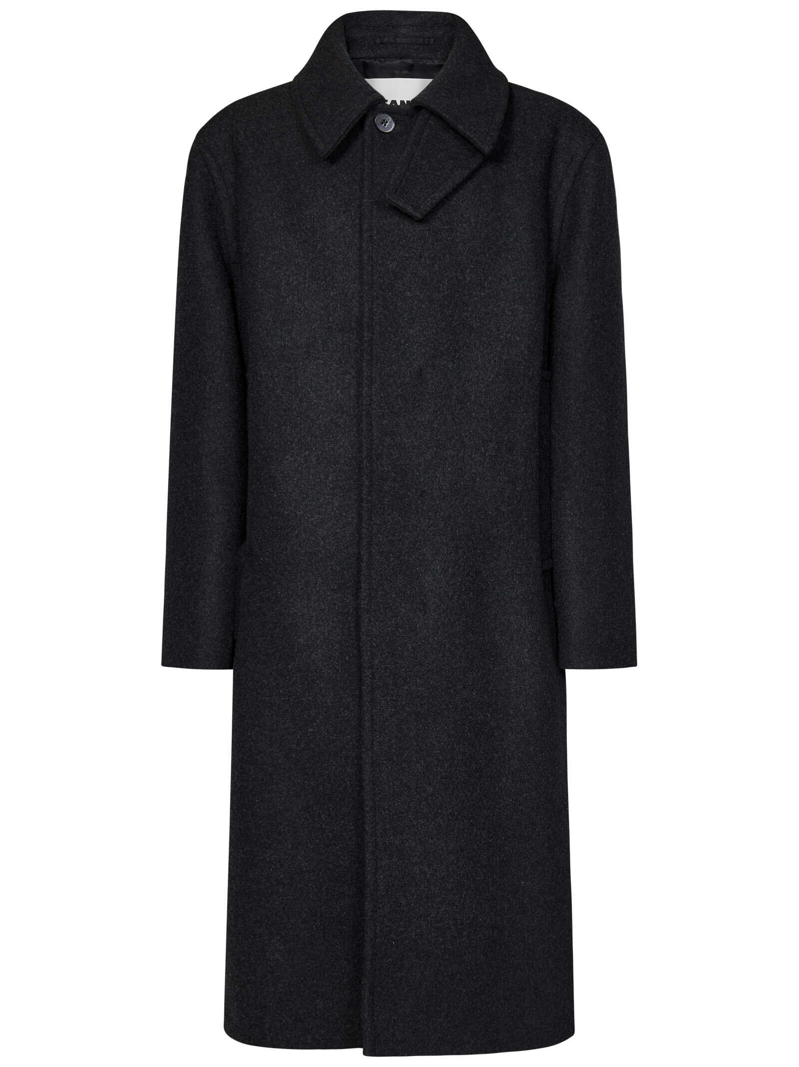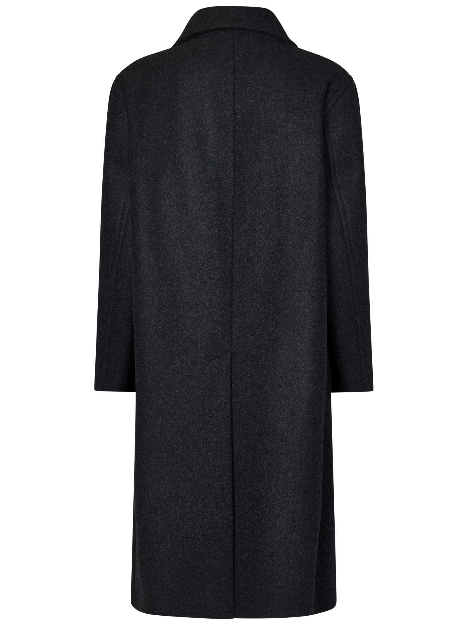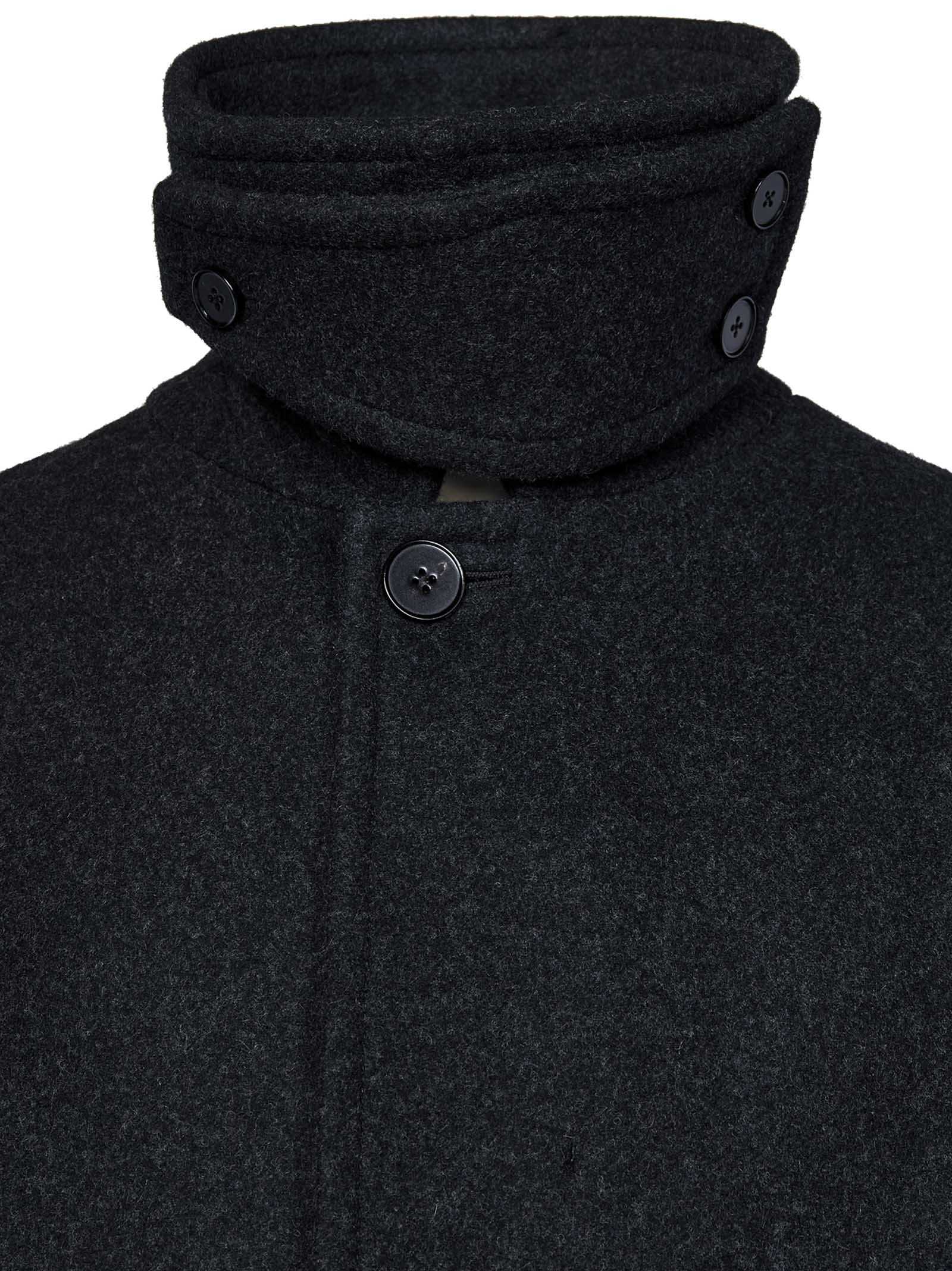 Oversized lava stone-colored wool single-breasted coat with detachable neck strap.