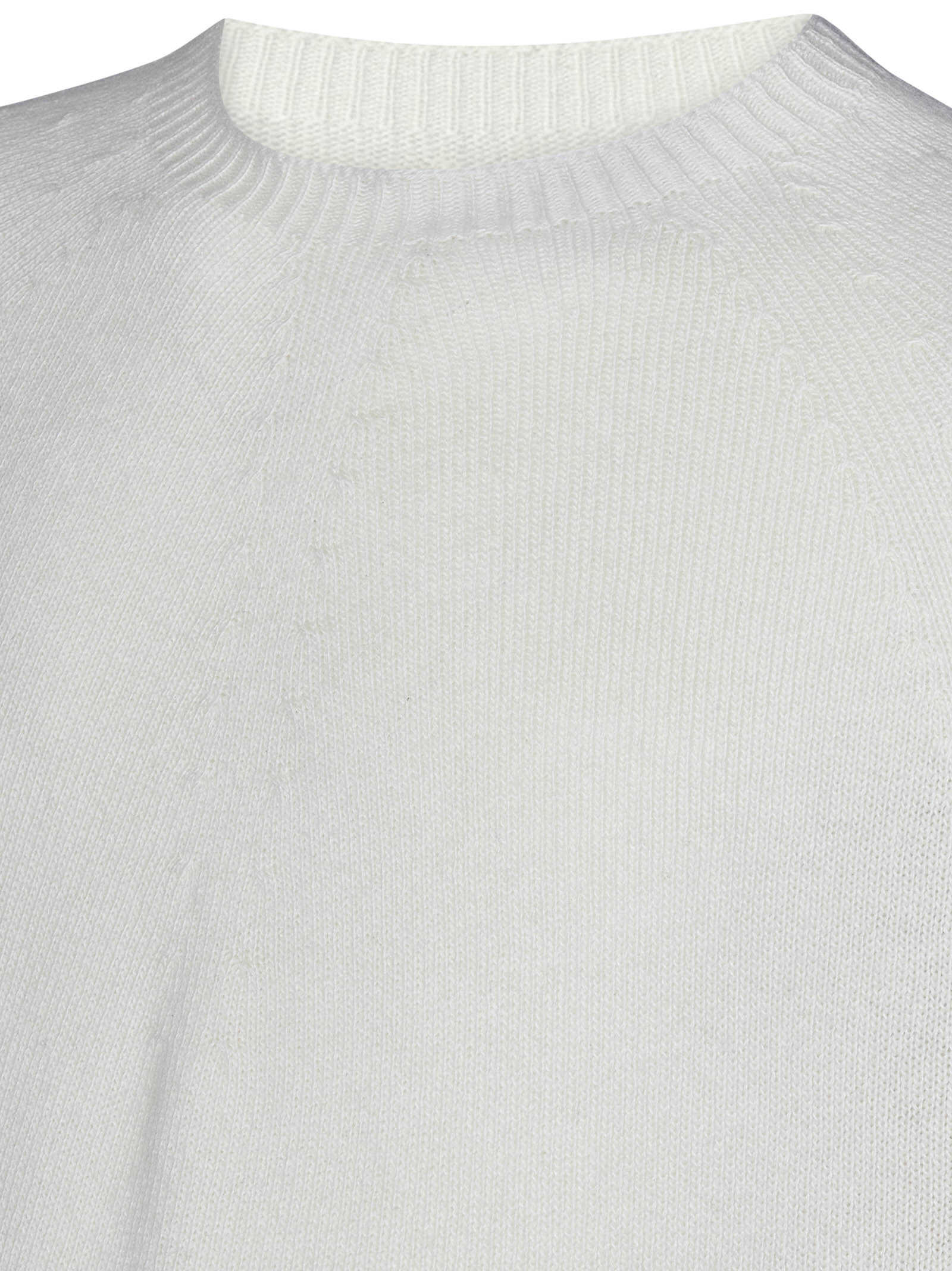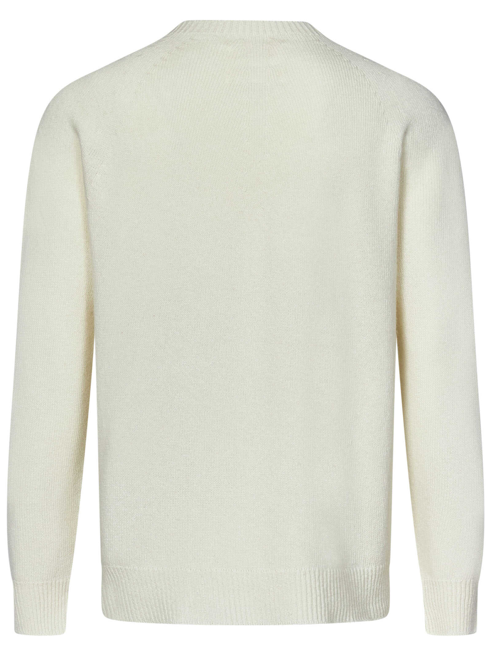 Eggshell-colored merino wool and cashmere knit crewneck sweater in with ribbed trims.