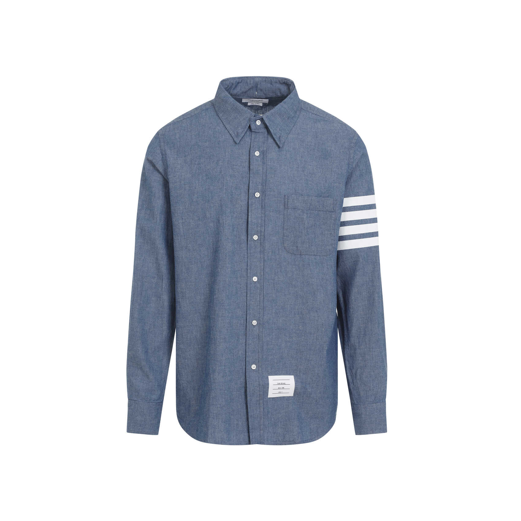 Elevate your style with this Thom Browne cotton shirt in classic blue. Featuring a pointed collar, front button fastening, chest pocket, and iconic logo patch, this shirt exudes sophistication. The contrasting white stripes on the sleeve add a modern touch, making it a versatile choice for any occasion. Made from 100% cotton, it offers comfort and style in one.
