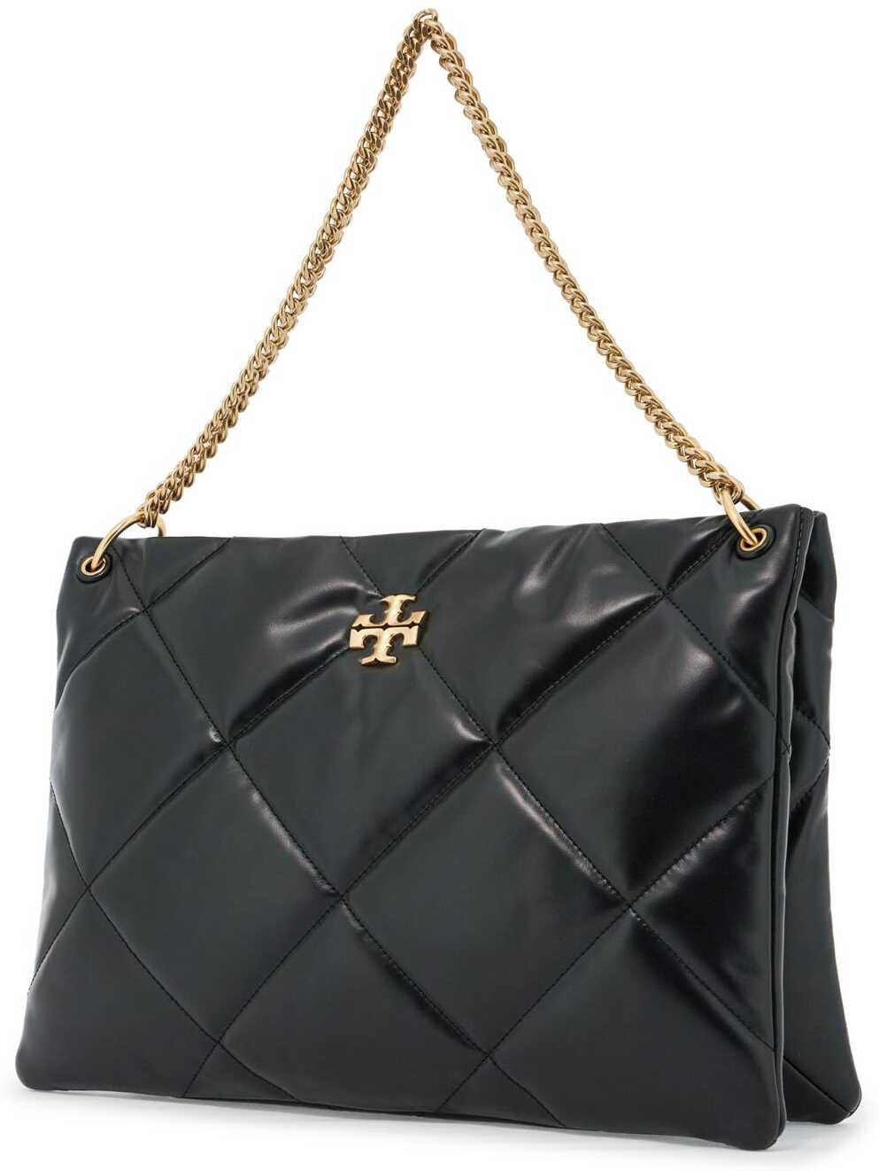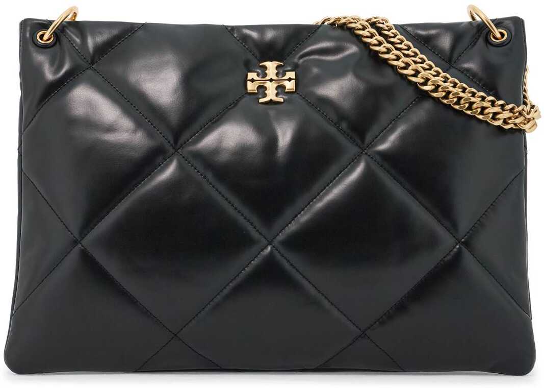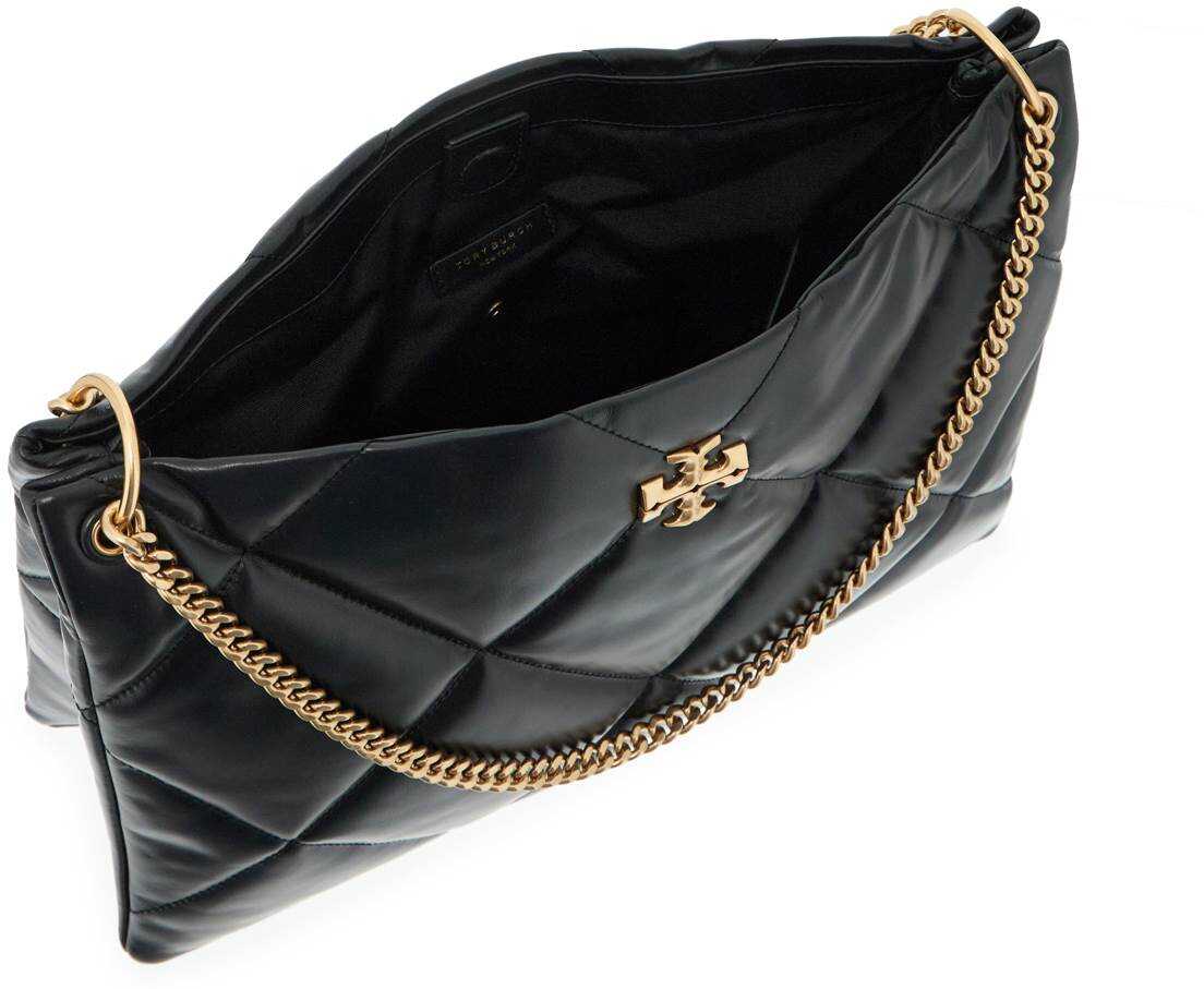 The Kira shoulder bag by Tory Burch is made of soft nappa leather with diamond quilting. Its classic shape is enhanced by the iconic double T metal logo on the front and a double chain handle. It features a magnetic closure, a fabric-lined interior with one snap-closed pocket and two open pockets. The hardware has a gold finish.
