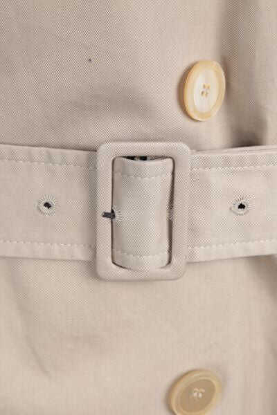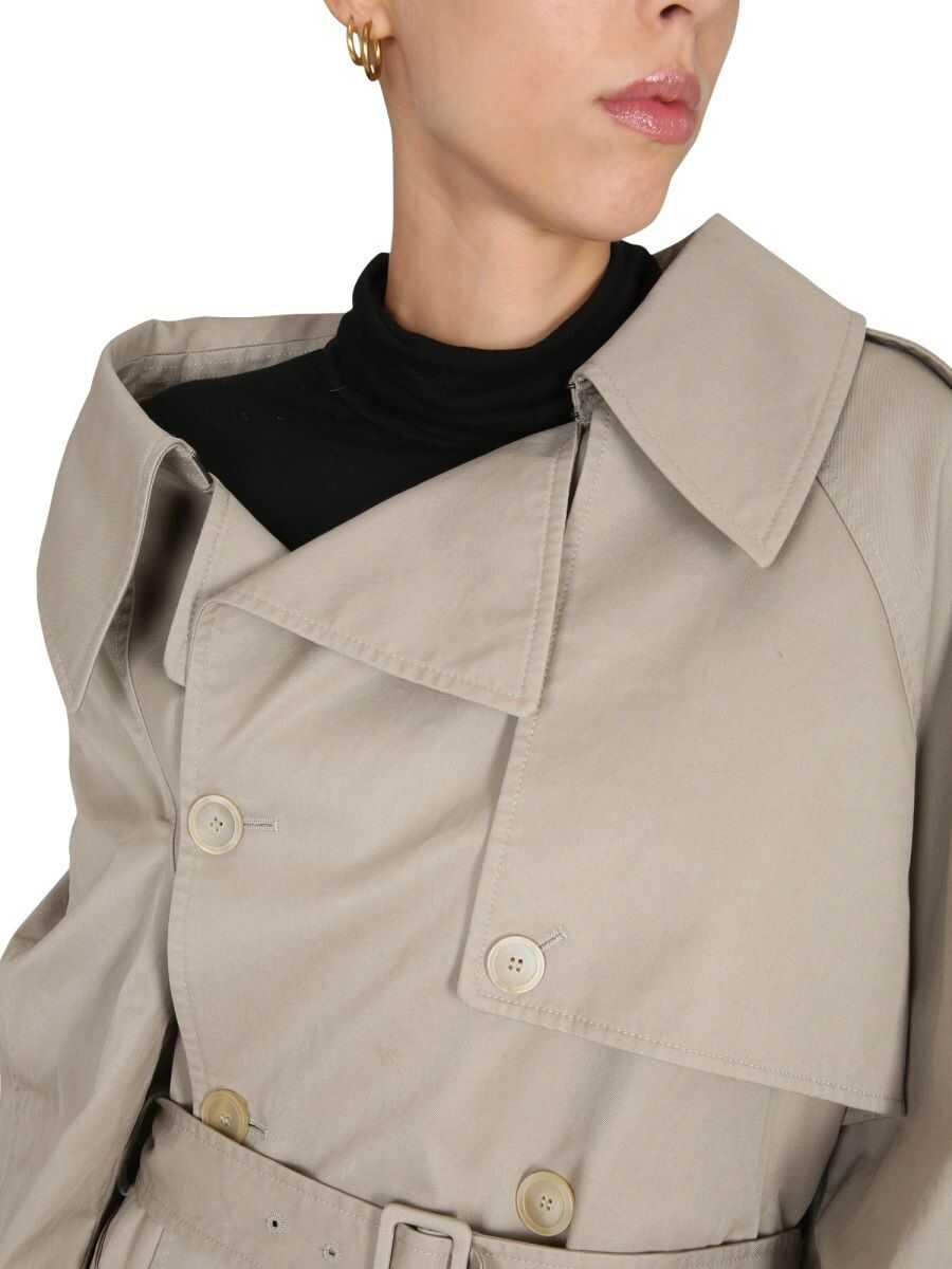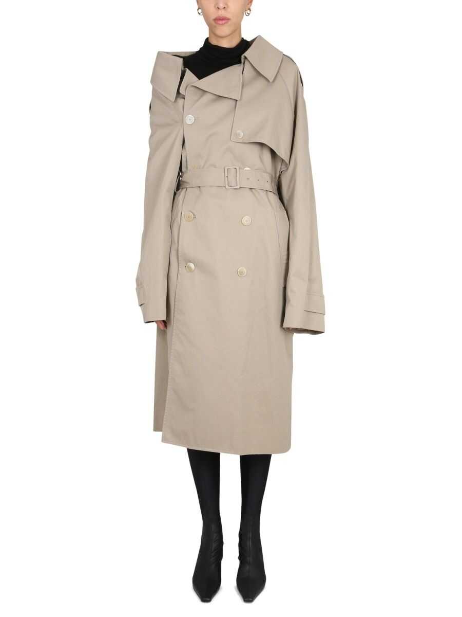 Balenciaga's double-breasted asymmetric coat crafted in beige cotton. It features convertible collar, asymmetric button closure on front, off-the-shoulder design, button tabs at shoulders / at cuffs, long sleeves with cut-out details, storm flap, matching belt, side welt pockets, back vent and check wool-lined interior.
