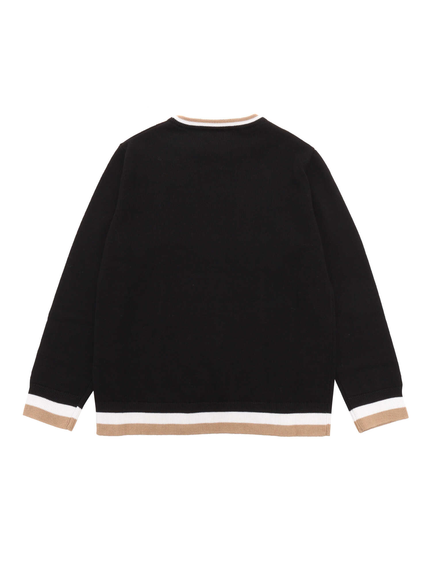 Cotton wool knit sweater, three-color ribbing at the bottom, collar and cuffs, "BOSS" logo printed on the chest, woven logo label on the side.