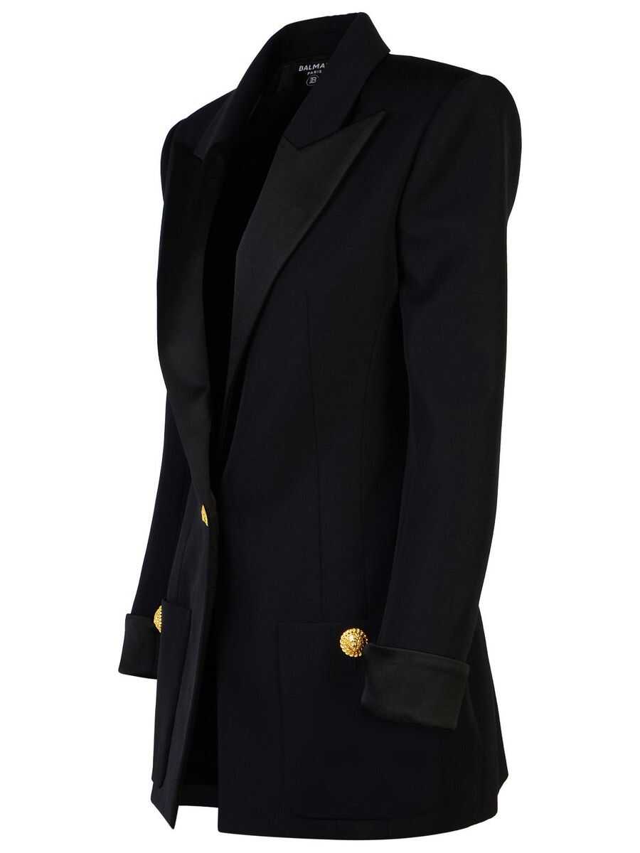 black wool grain de poudre logo-engraved buttons peak lapels shoulder pads long sleeves turn-up cuffs front button fastening two side patch pockets straight hem