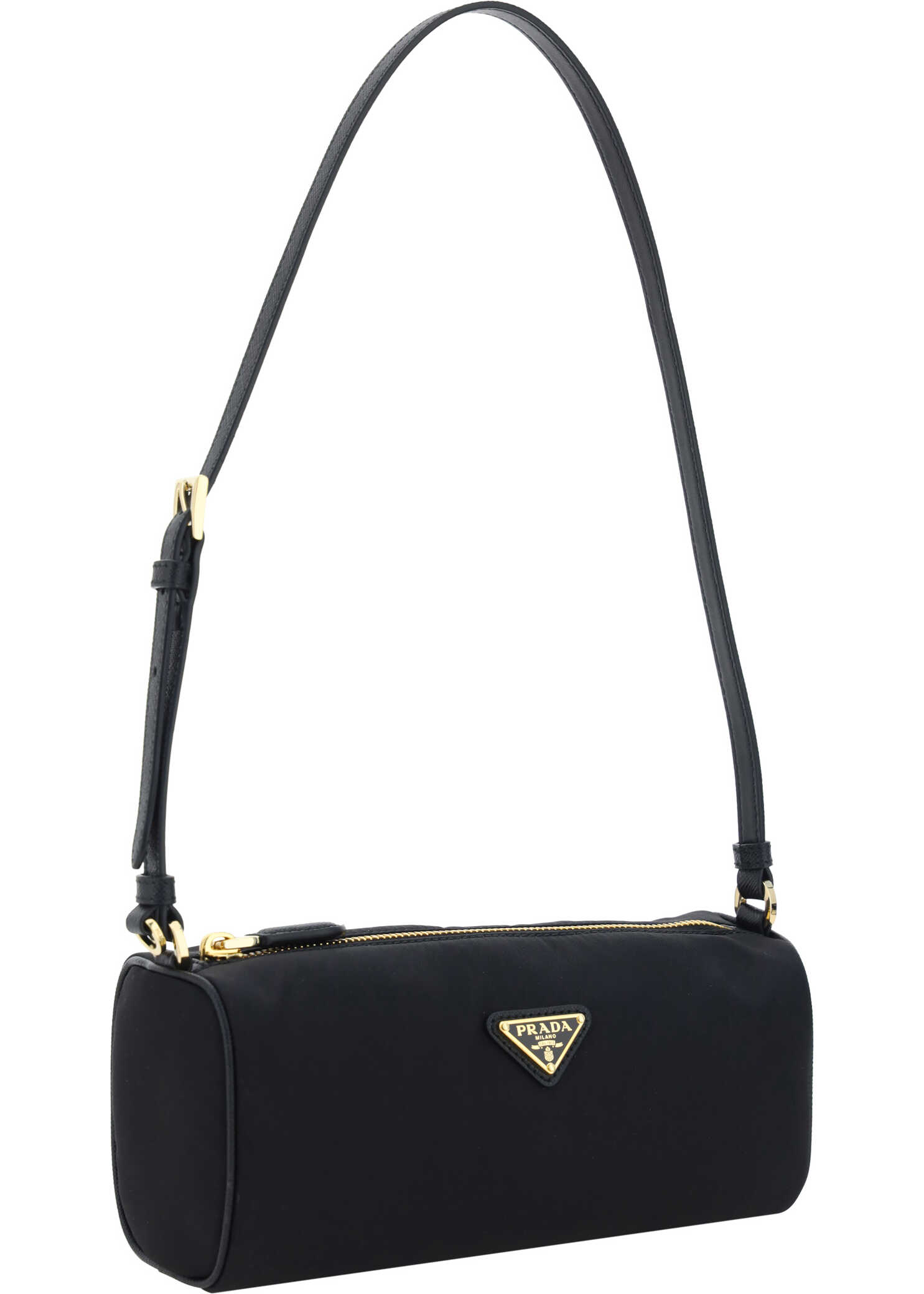 Re-Nylon Shoulder Bag by Prada, tubular design, one adjustable flat handle, top zipper closure, single compartments, iconic enameled triangular brand signature plaque applied to front, monochrome pattern.