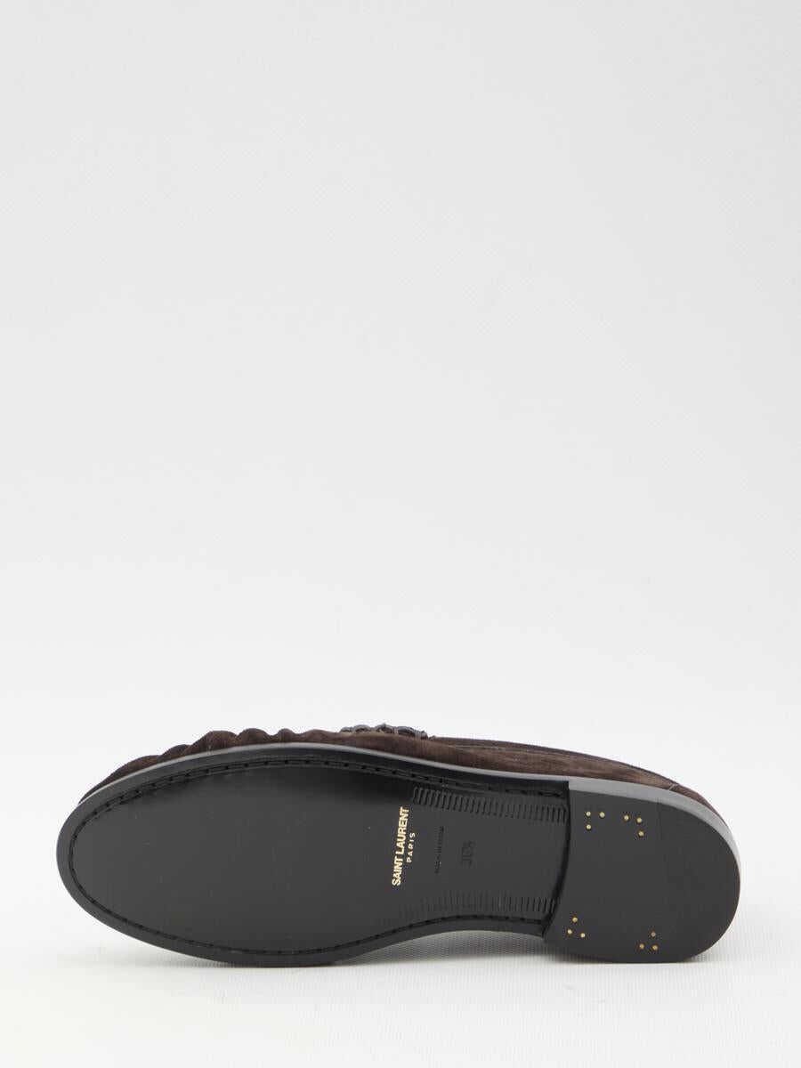 Le Loafer loafers in dark brown suede with gold-tone metal Cassandre. They feature hand-sewn construction and leather sole. Dust bag included. Any leather imperfections are not to be considered manufacturing defects, but a peculiarity of the material.