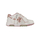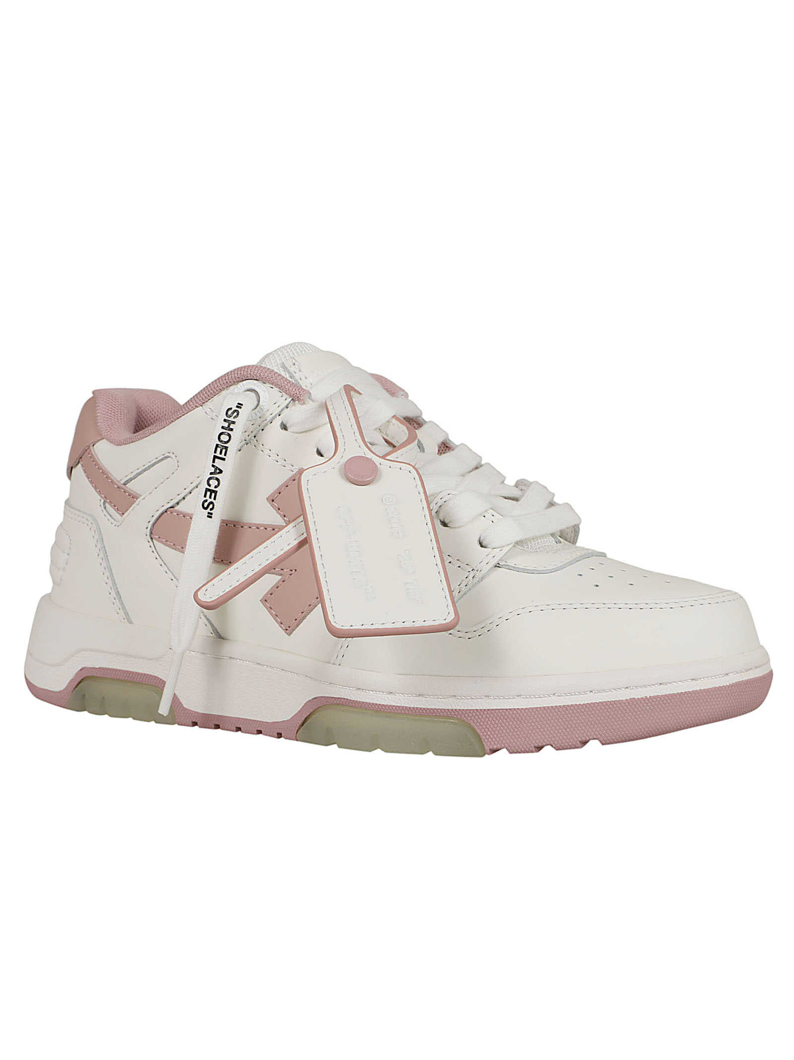 Out Of Office "Ooo" low-top sneakers from OFF-WHITE featuring white, light pink, calf leather, colour-block panelled design, signature Safety tag, signature Arrows motif, contrasting branded heel counter, logo-debossed tongue, branded insole, front lace-up fastening, round toe, perforated toebox and flat rubber sole. Due to the dyeing process used, this product must not come into contact with water..
