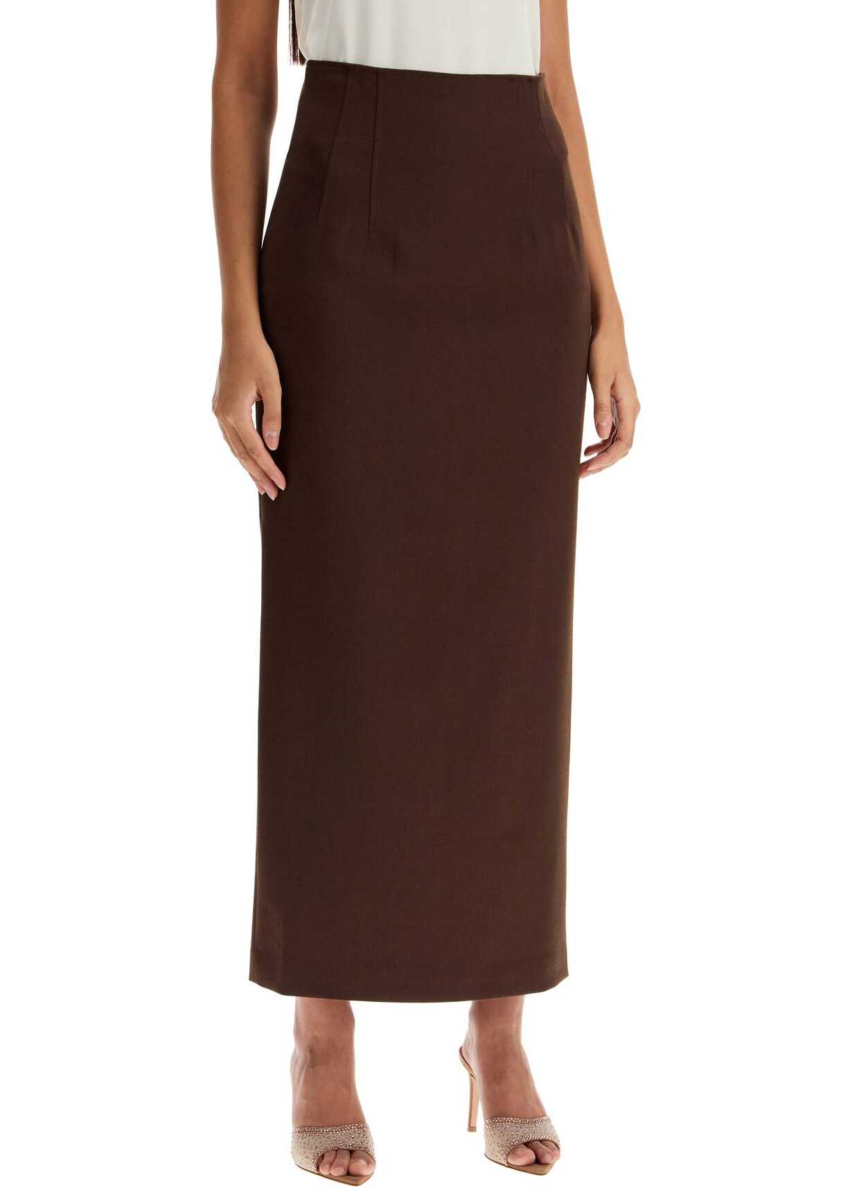 The Andamane Long Skirt features a pencil silhouette with defined high waist and pleats. Made from a stretch wool blend, it has a minimal design with an invisible side zip and back slit. Fully lined. The model is 177 cm tall and wears size IT 40.