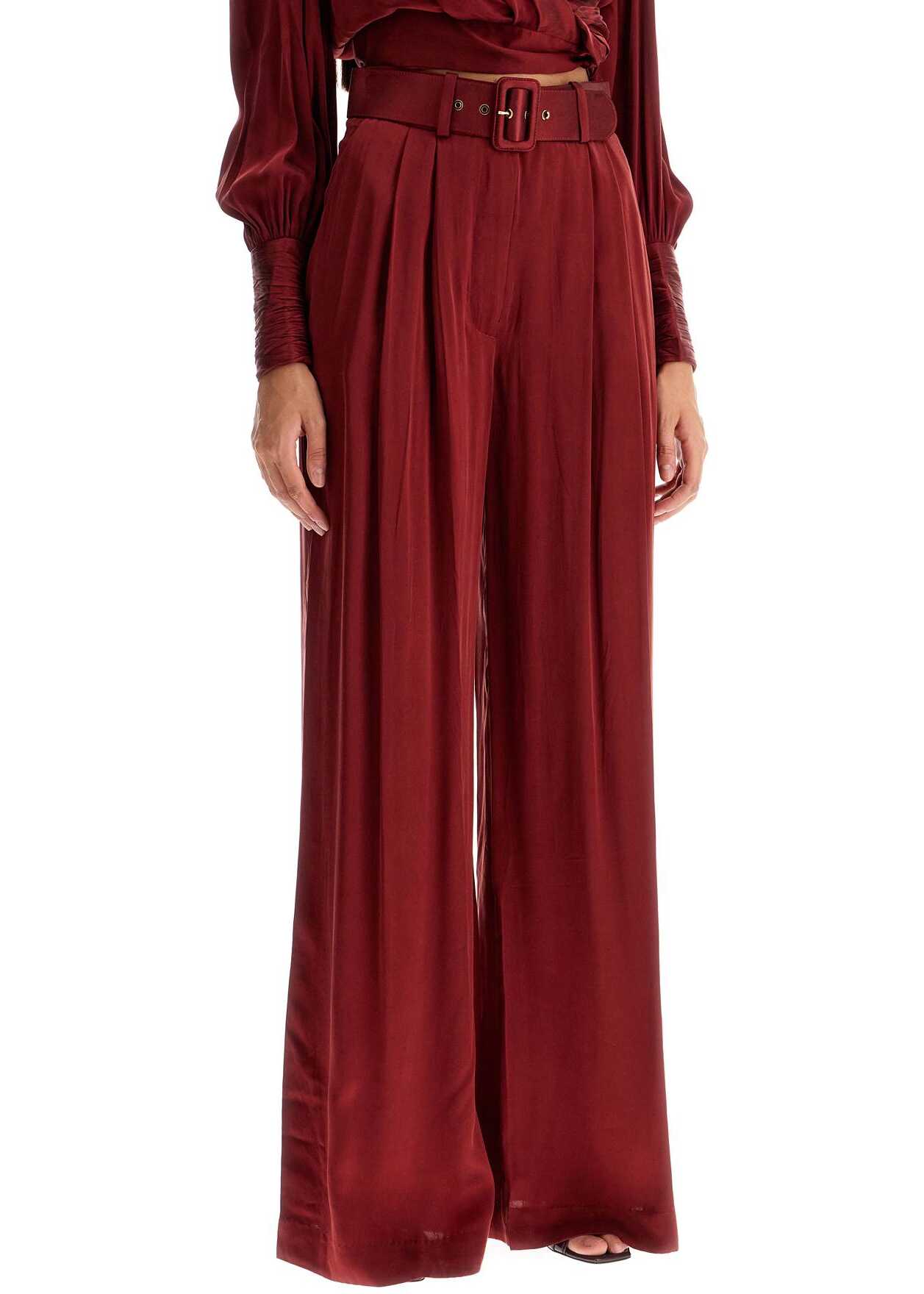 Crafted from fluid pure silk with a handcrafted finish, these Zimmermann pants stand out for their elegant palazzo silhouette enhanced by a high waist and front pleats. They feature a concealed hook and zip closure, French pockets, and come with a matching belt with a rigid buckle. The model is 177 cm tall and wears a size 0.