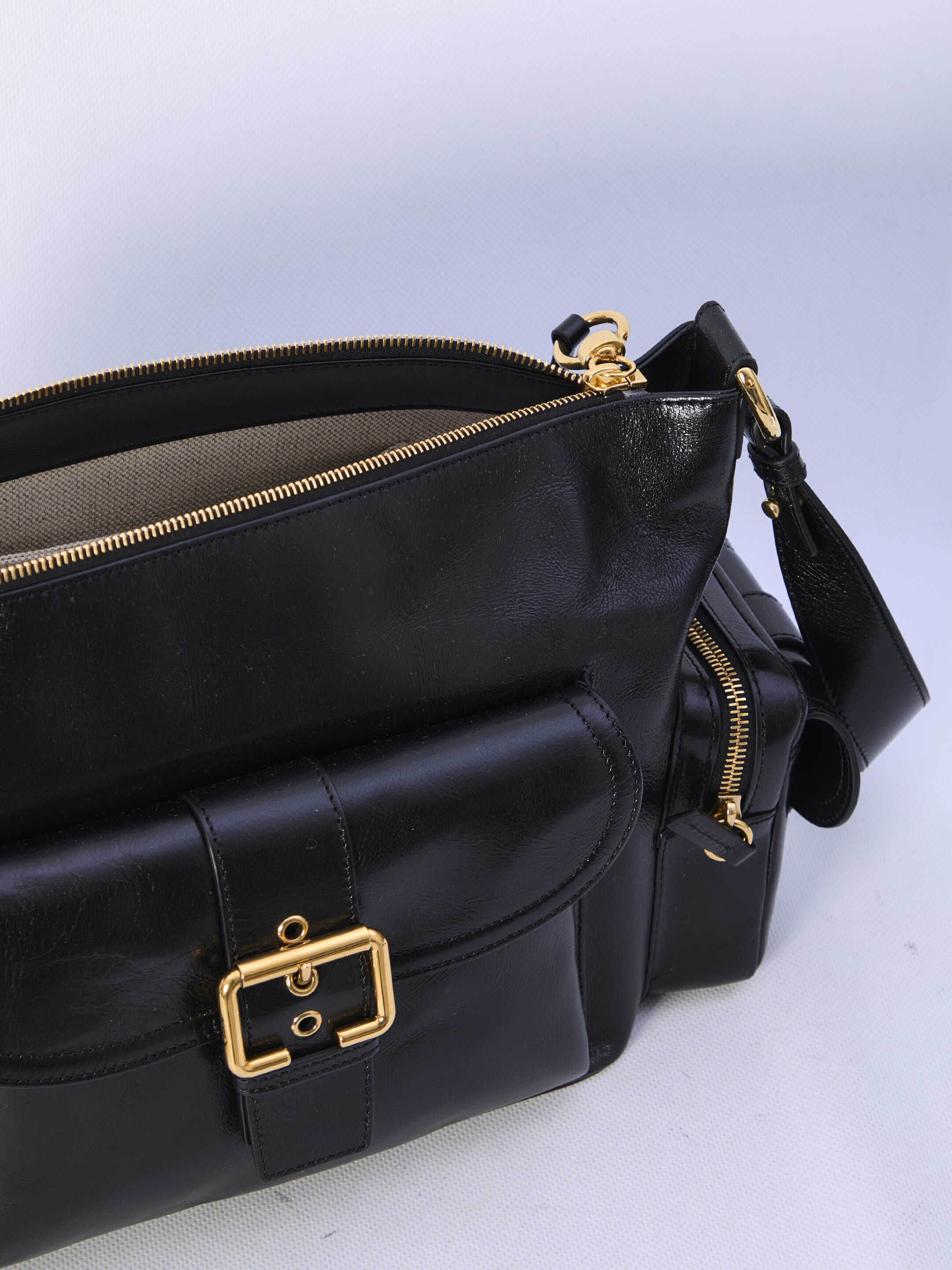 Camera Bag in black natural buffalo leather. It features adjustable and detachable shoulder strap, detachable handle, one main interior compatment, one interior flap pocket, two double side pockets with flap and zip closure and one front pocket with magnetic flap closure. Dust bag included. Any leather imperfections are not to be considered manufacturing defects, but a peculiarity of the material.