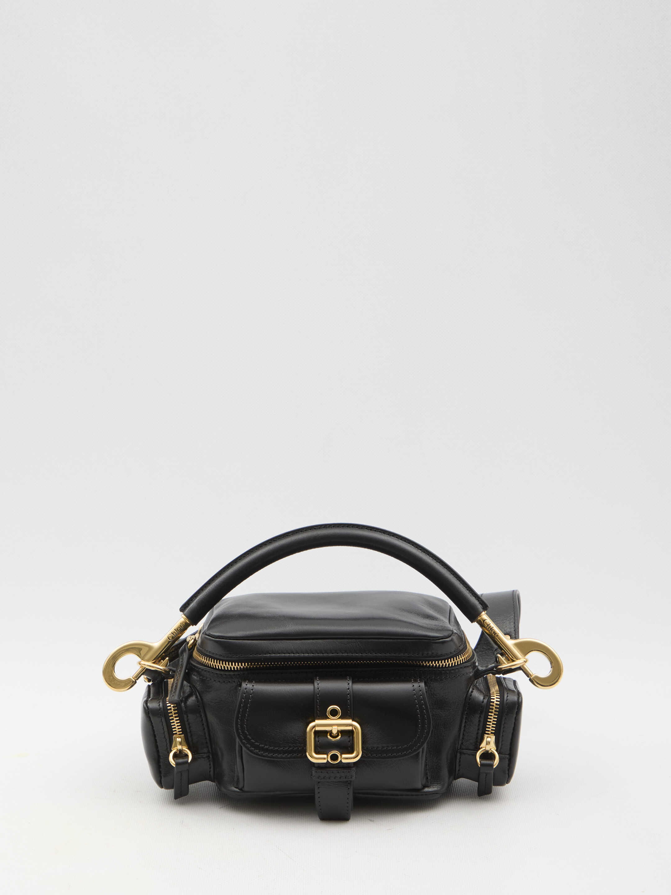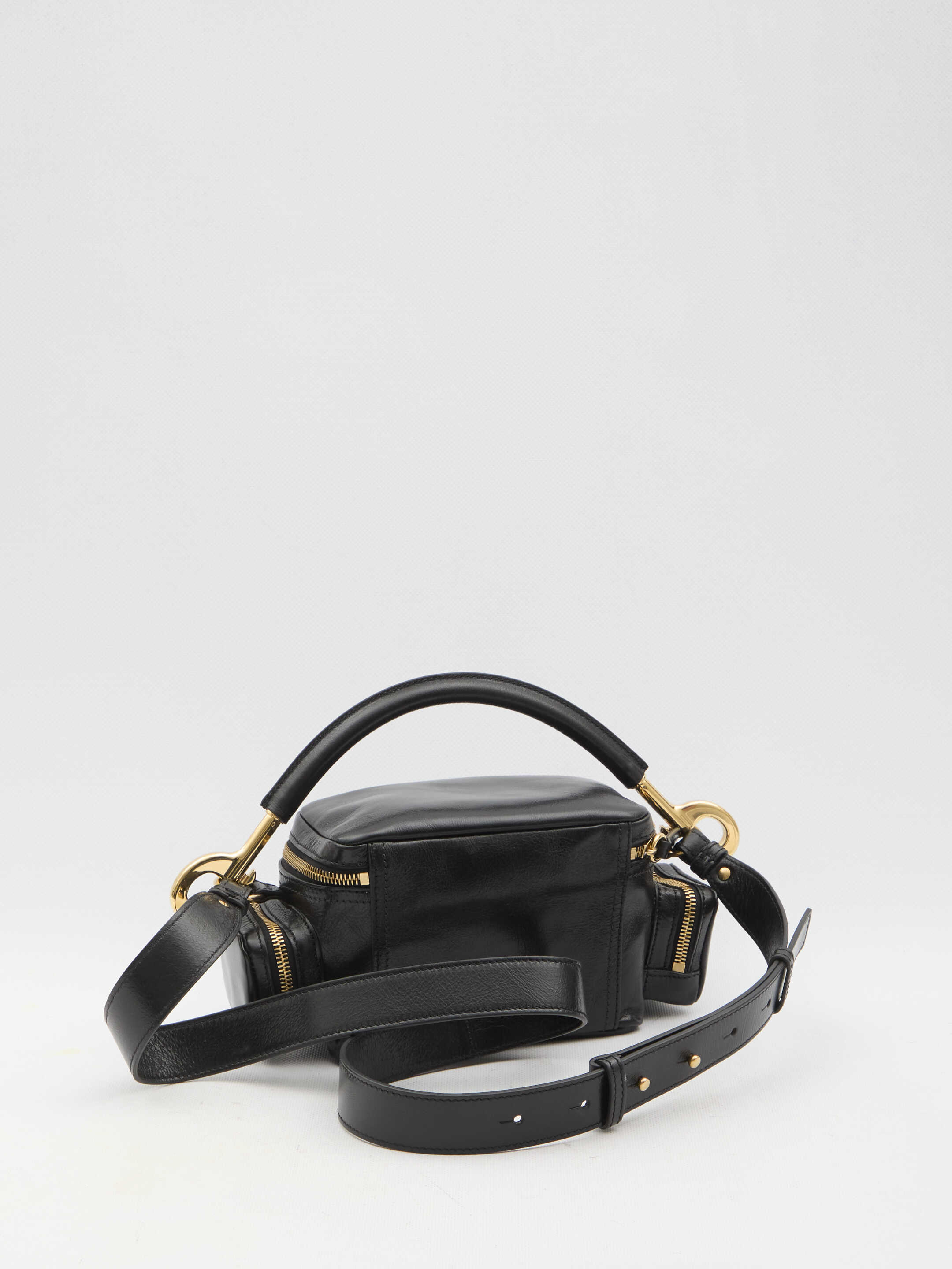 Small Camera Bag in black shiny buffalo leather with gold-tone metal hardware. It features detachable handle, adjustable and detachable shoulder strap, two-way zip closure, one main interior compartment and one interior slip pocket. Two side pockets with zip closure and one front pocket with magnetic flap closure. Cotton and linen lining. Dust bag included. Any leather imperfections are not to be considered manufacturing defects, but a peculiarity of the material.