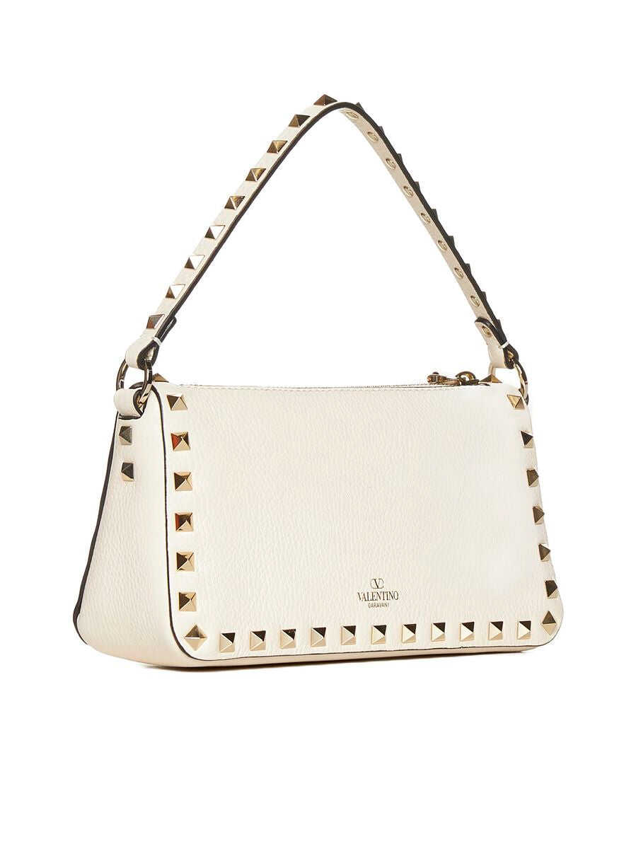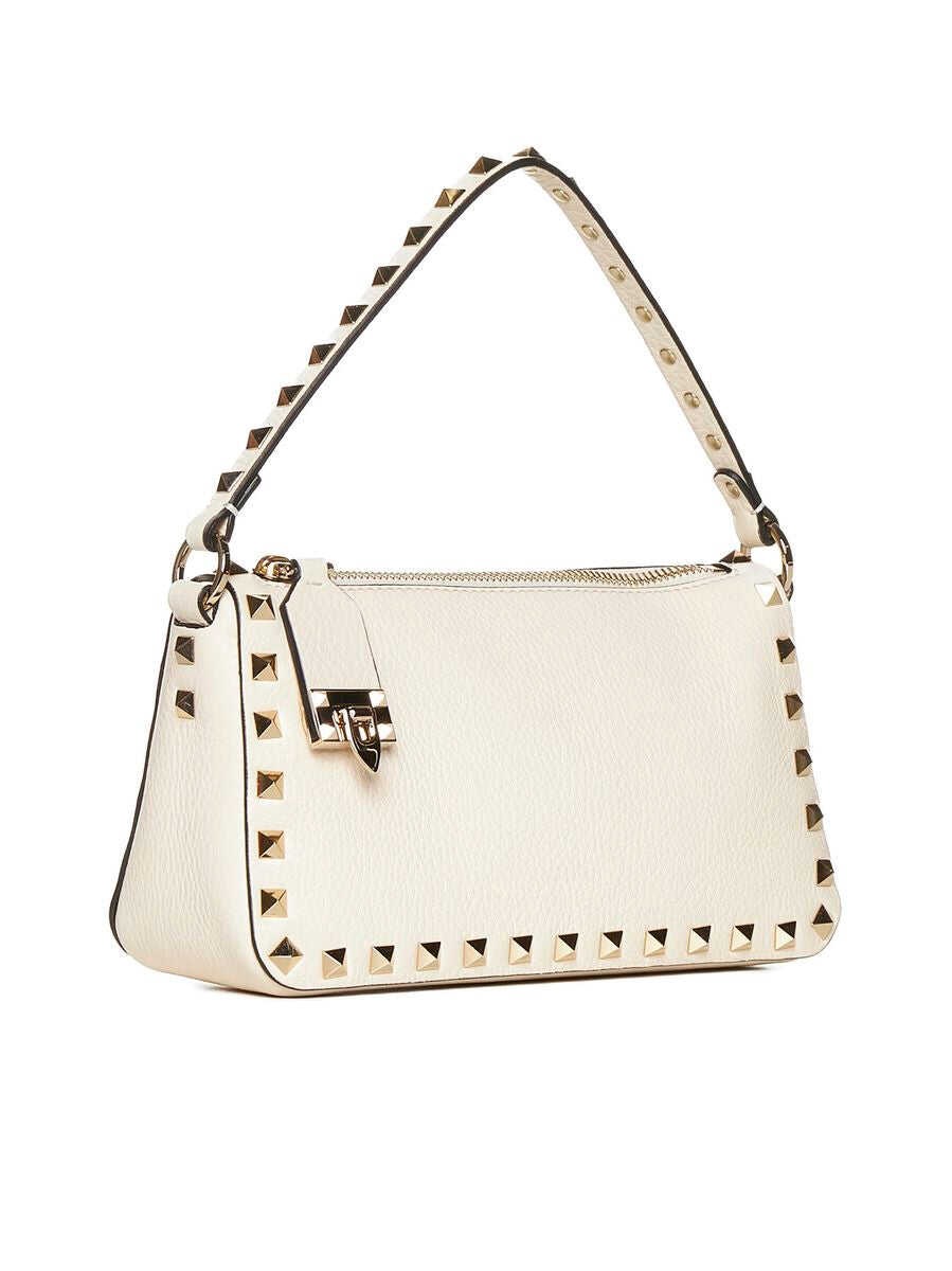 Cream-colored shoulder bag with decorative studs, silver-colored hardware, top handle, removable adjustable shoulder strap, zip closure and internal flat pocket.