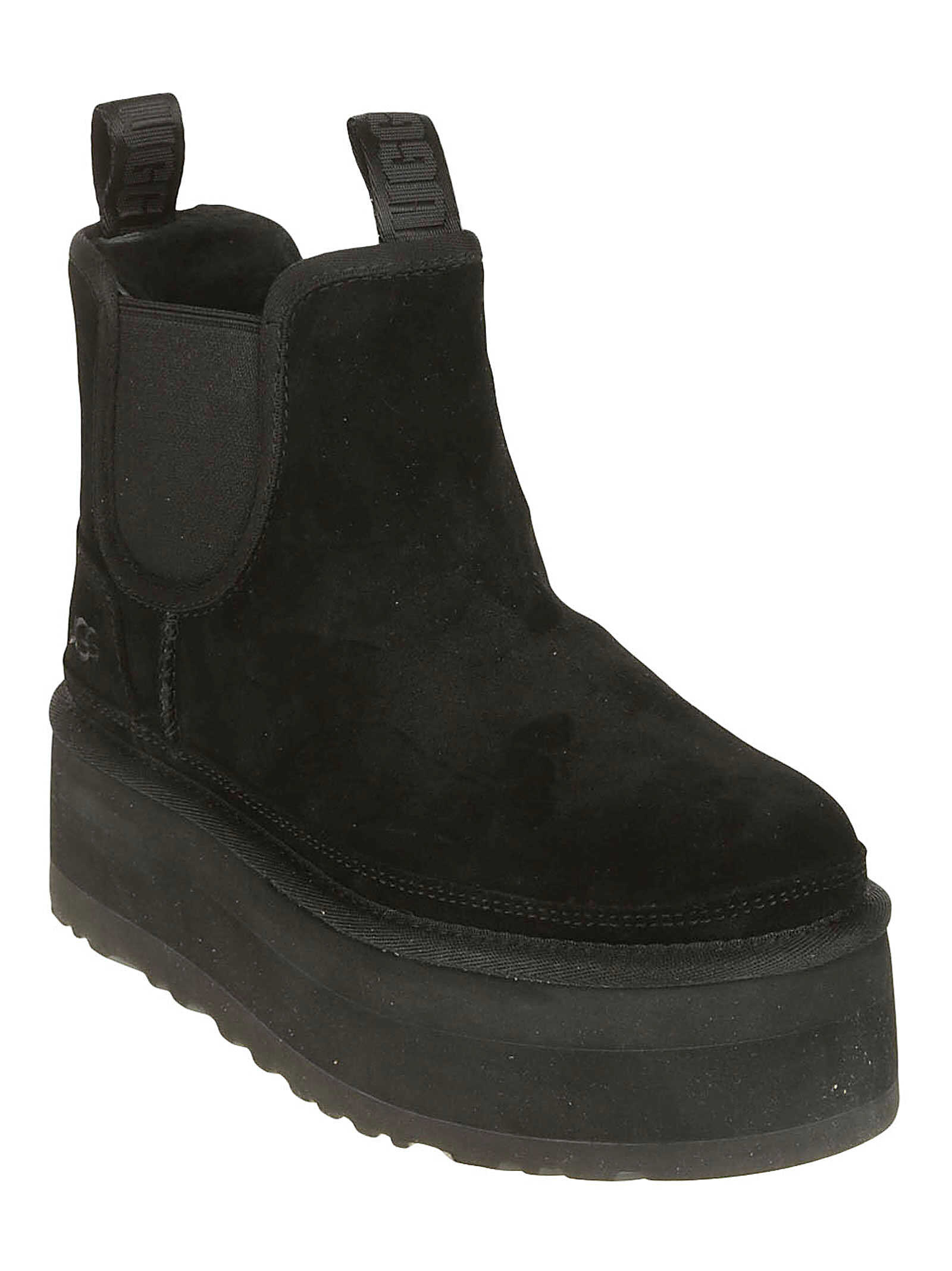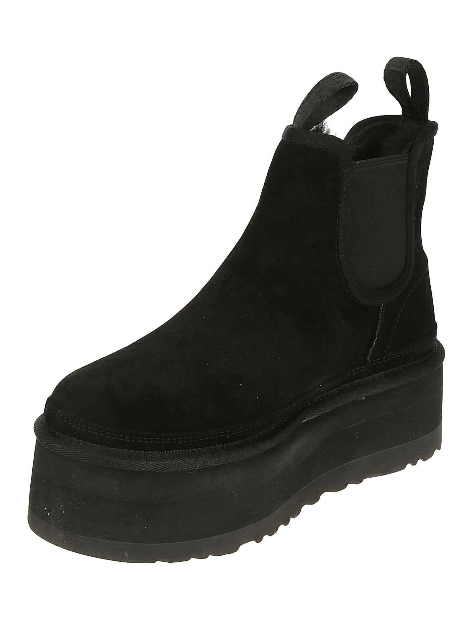 UGG boot with suede upper, elastic gusset, back strap, front strap, UGGplush™ insole made of 80% regenerated wool and 20% lyocell (17 mm), EVA midsole, platform height: 5 cm. US size chart.