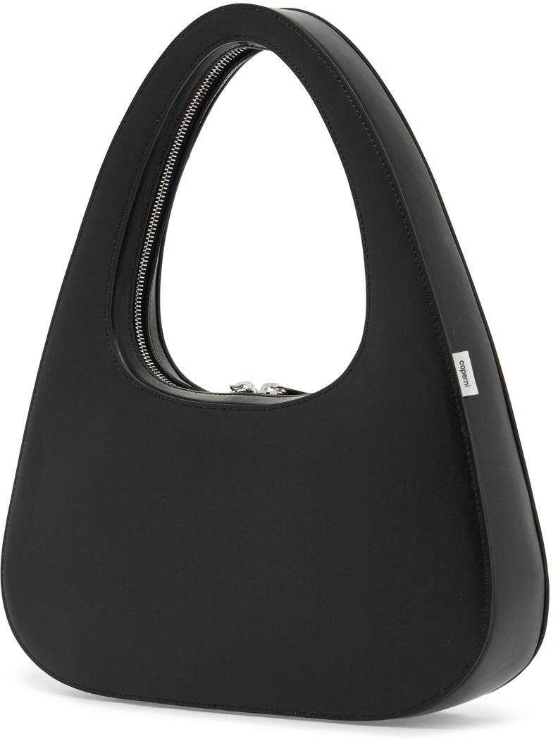 This Baguette Swipe hobo bag by Coperni, made of smooth leather, offers a more sculptural interpretation of the classic baguette style: instead of a rectangular shape, the handle is joined to the bag to create a drop-shaped form with a hollow oval center. Completing the design is a silver zip closure with two pulls along the handle and a laminated logo detail on the front.