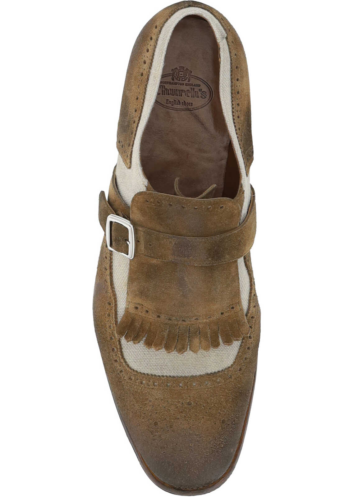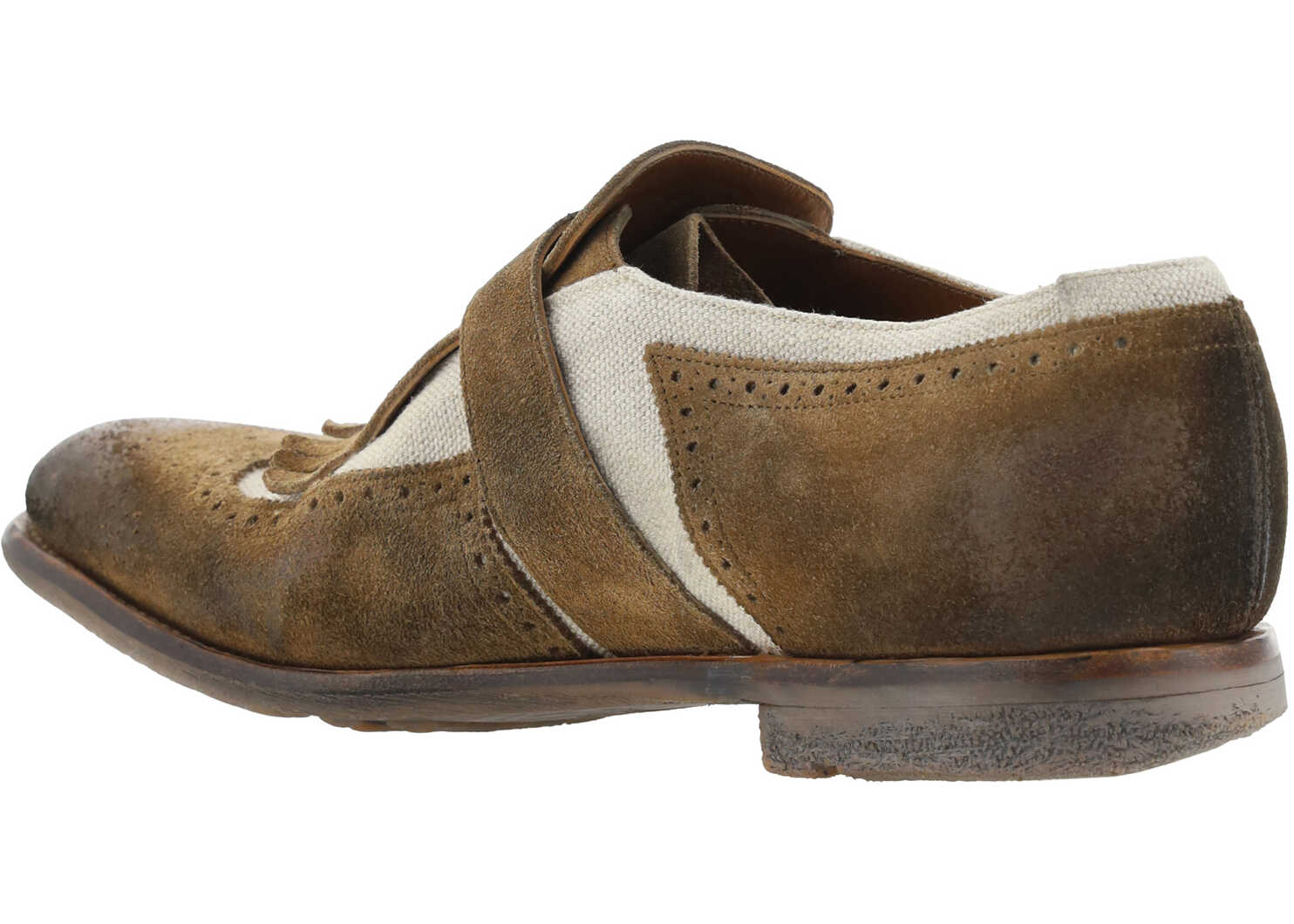 Leather Shangai Loafers by Church's, vintage worn-effect leather design, suede detailing, raised almond toe at front with perforated detailing, slight block heel, vintage rubber sole with rivets, front tray embellished with metal buckle, logo-embellished press-studded insole.