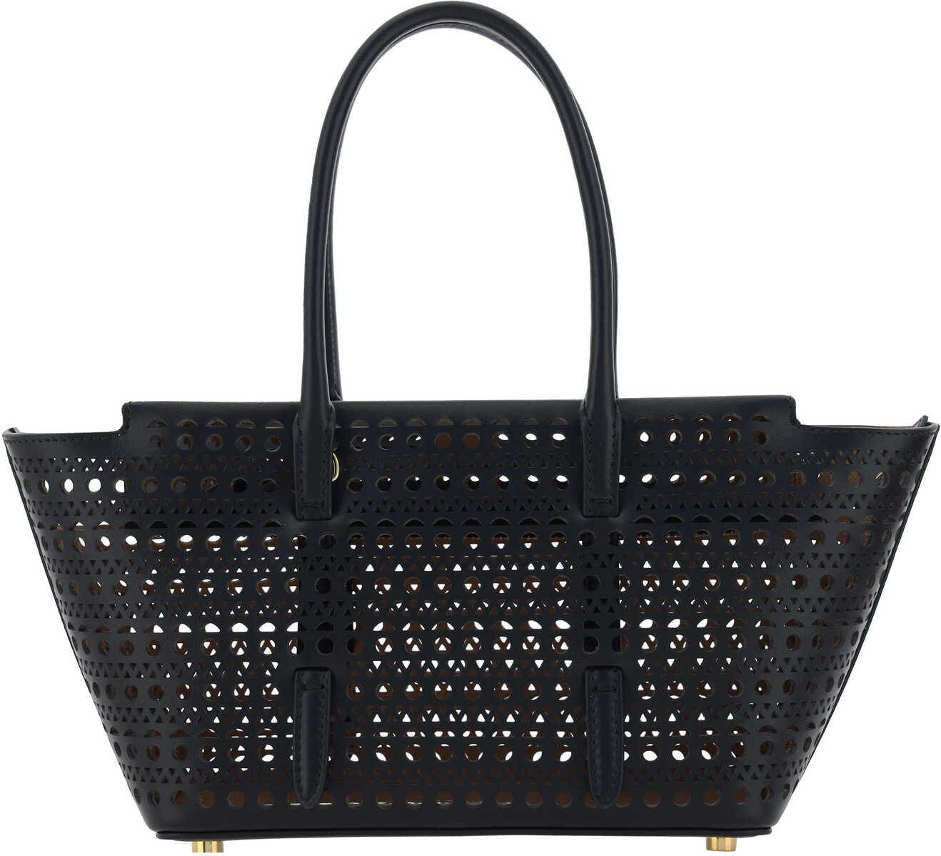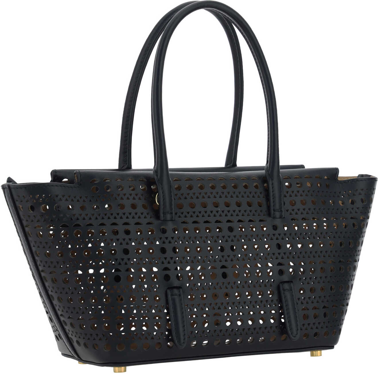 Calfskin New Mina 20 Handbag by Alaïa, design with perforated geometric details, two tubular and rigid top handles, single interior compartment, adjustable shoulder strap, removable pouch by snap hook, metal support feet attached to base of bag.