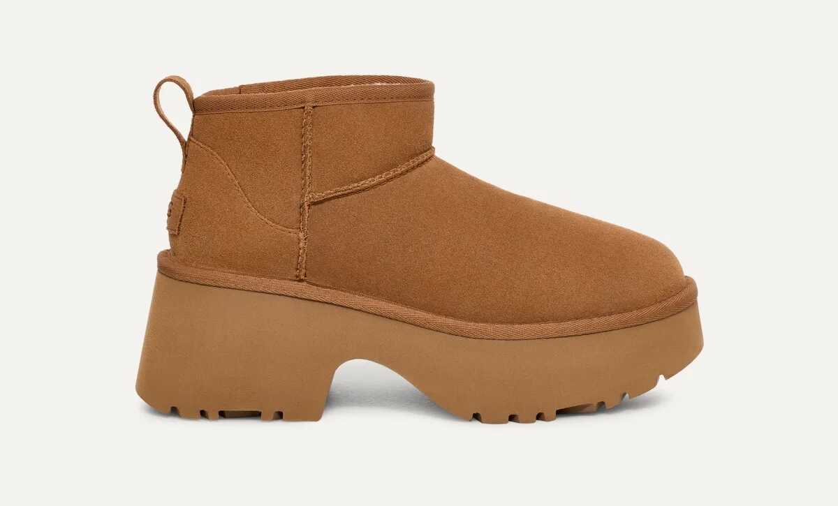 `UGG Ultra Mini ankle boot with 7 cm high heel in suede leather, UGGplush™ lining, and short shaft.`