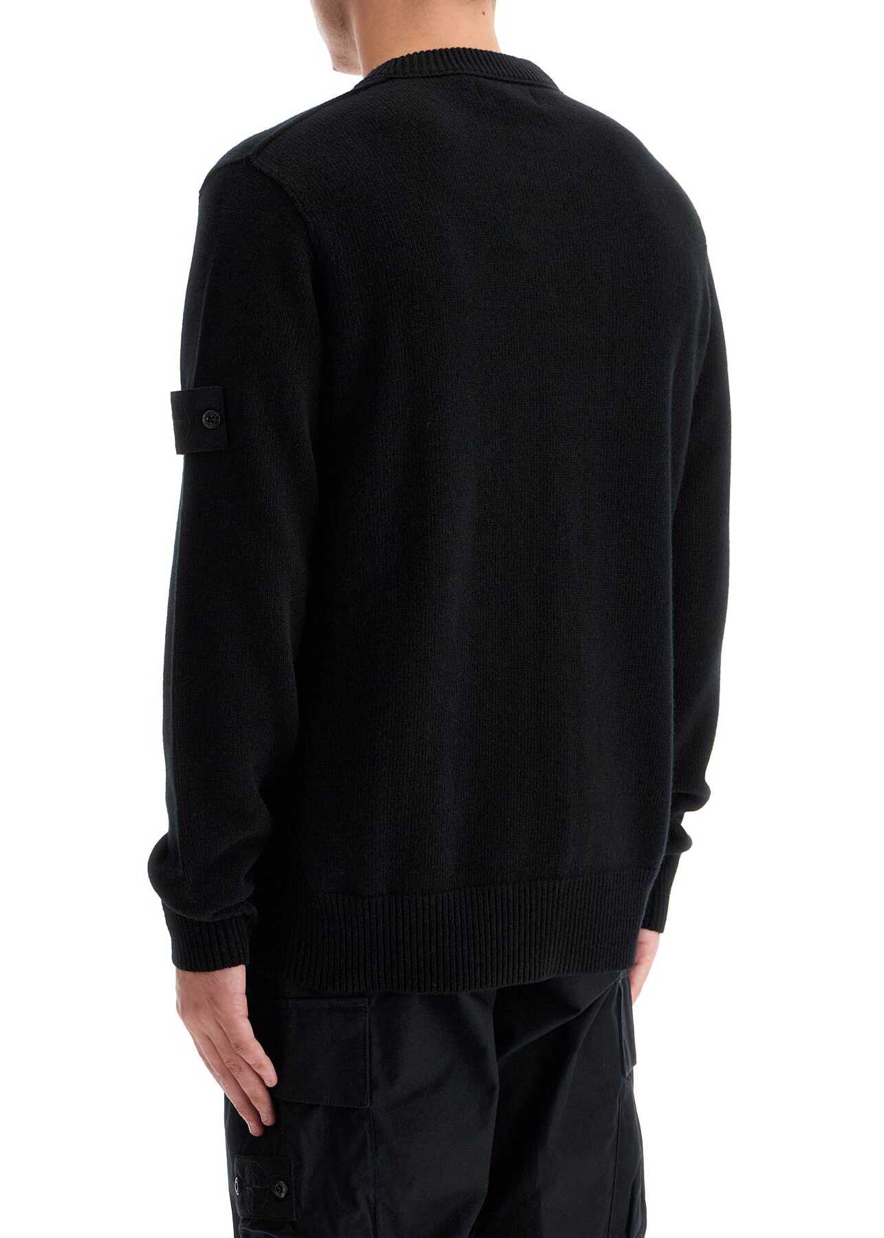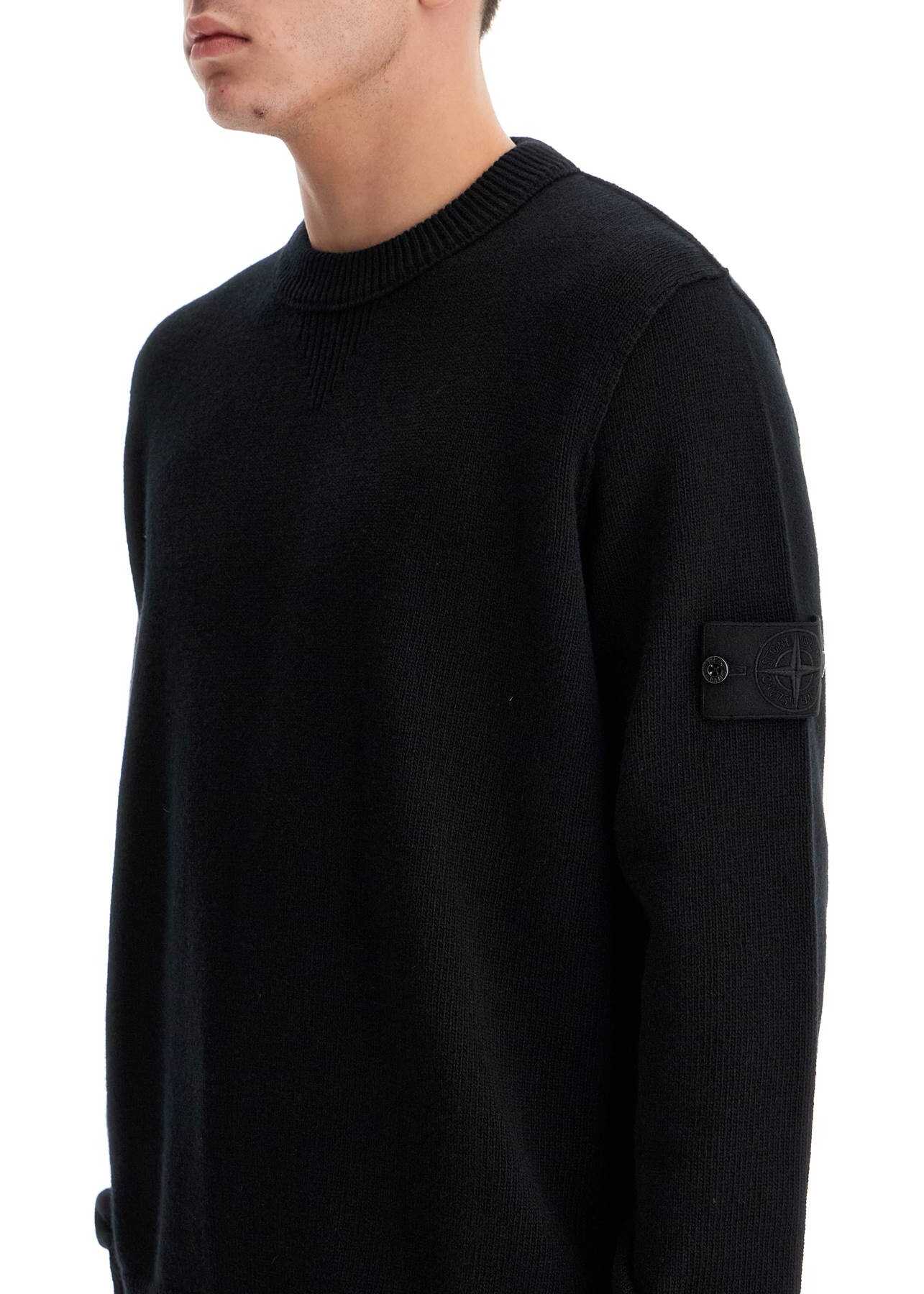 This Stone Island crewneck sweater is made of RWS virgin wool knit, with ribbed finishes on the collar, cuffs, hem and sides. It features visible stitching details on the shoulders and an iconic monochromatic Ghost series badge on the left sleeve. The fit is regular and the model is 182 cm tall, wearing a size L.