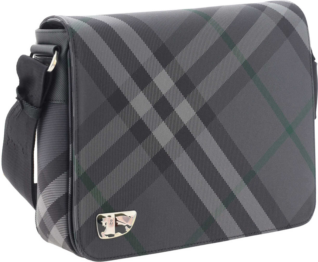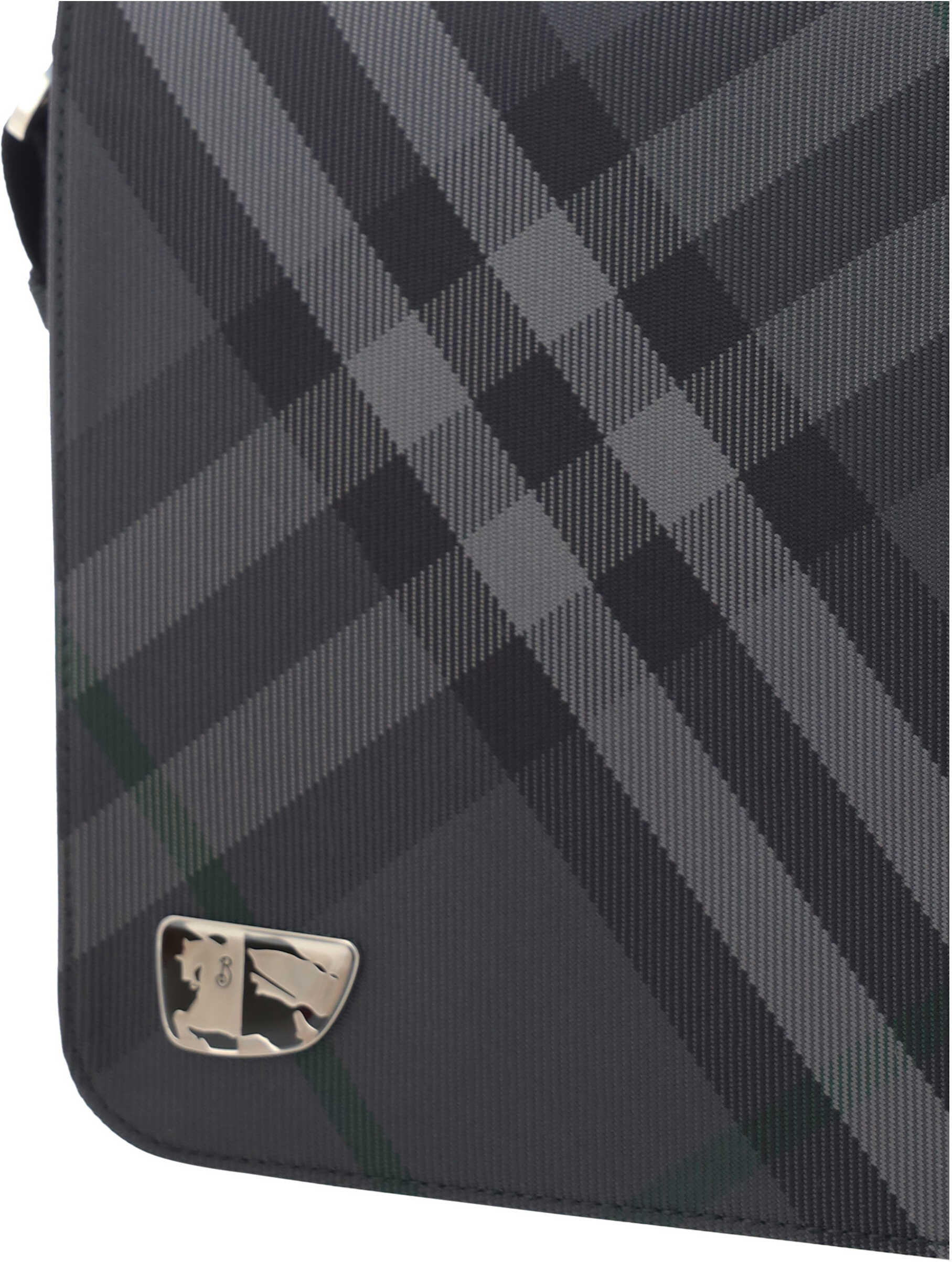 Shoulder Bag by Burberry, adjustable flat shoulder strap, front closure by magnetic flap, zippered welt pocket on back, three-dimensional iconic Equestrian Knight logo plaque applied on front, leather detailing, iconic all-over repeated brand Archivio Check pattern, single interior compartment.