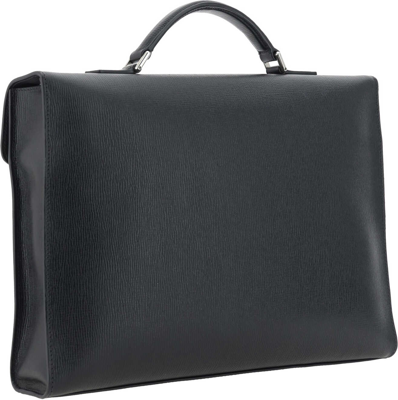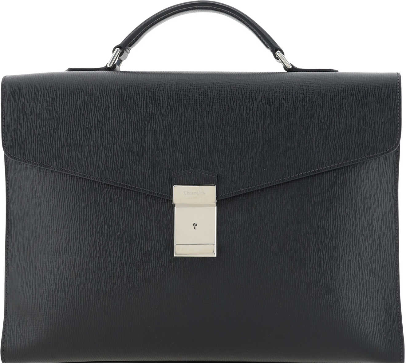 Leather Business Handbag by Church's, stiff top handle, front flap closure with metal hook applique on front, large interior compartment.