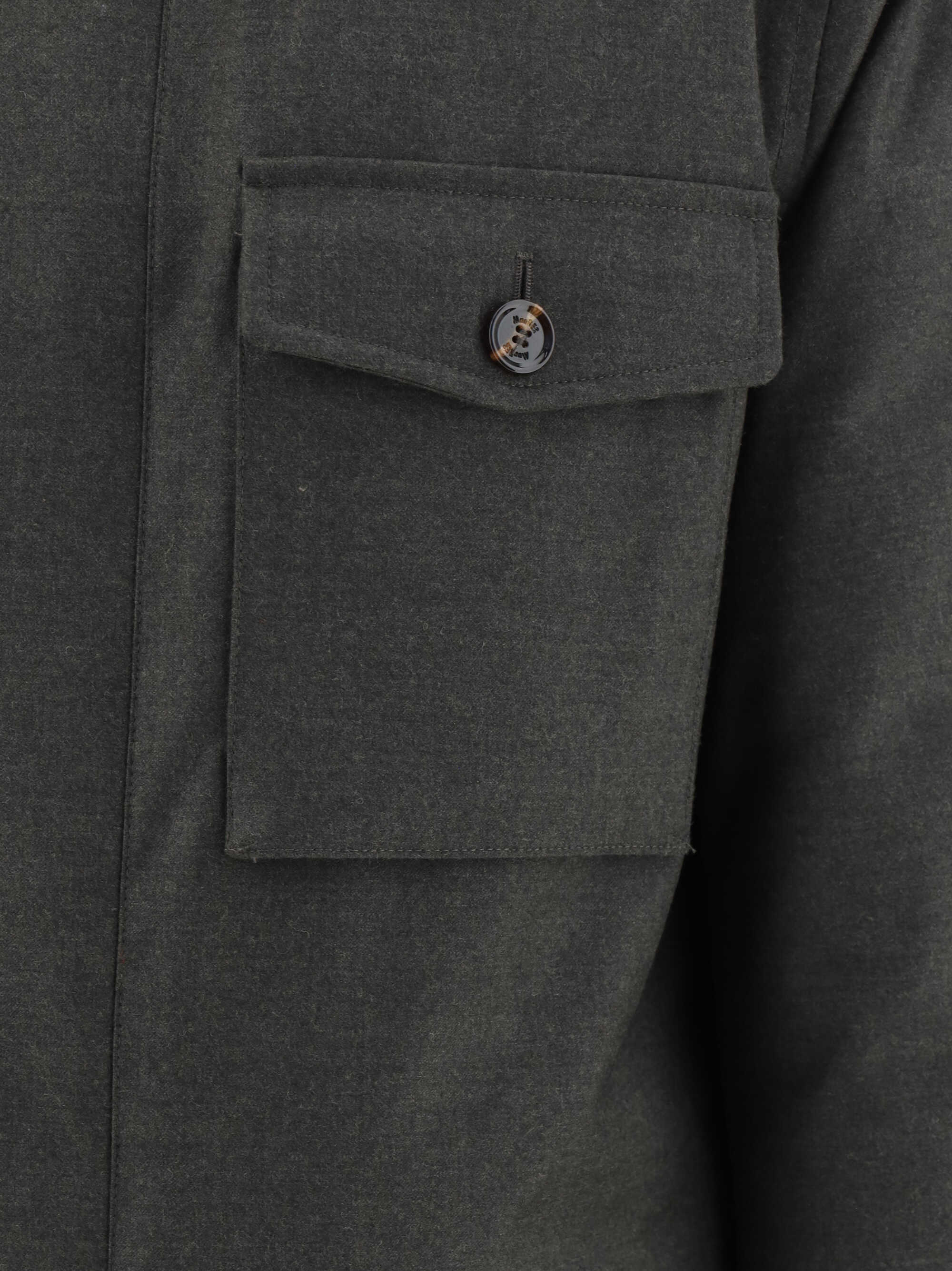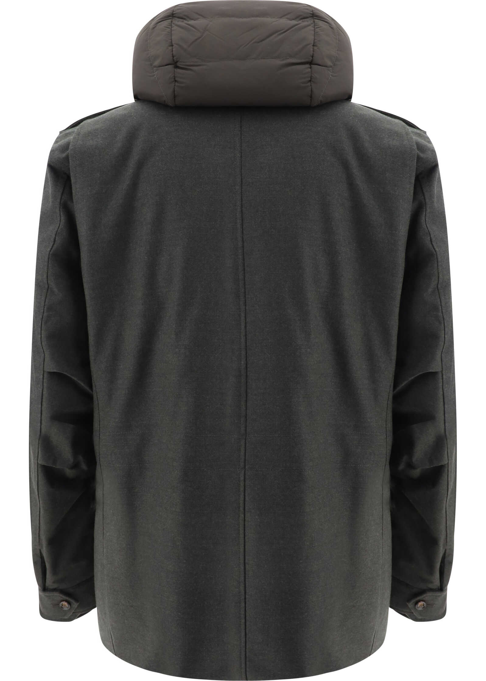 Down Jacket by Moorer, model with drawstring-adjustable hood, front closure by double-slider zipper, two front patch pockets with flap and button, two front welt pockets with flap and button, quilted and padded inner lining.