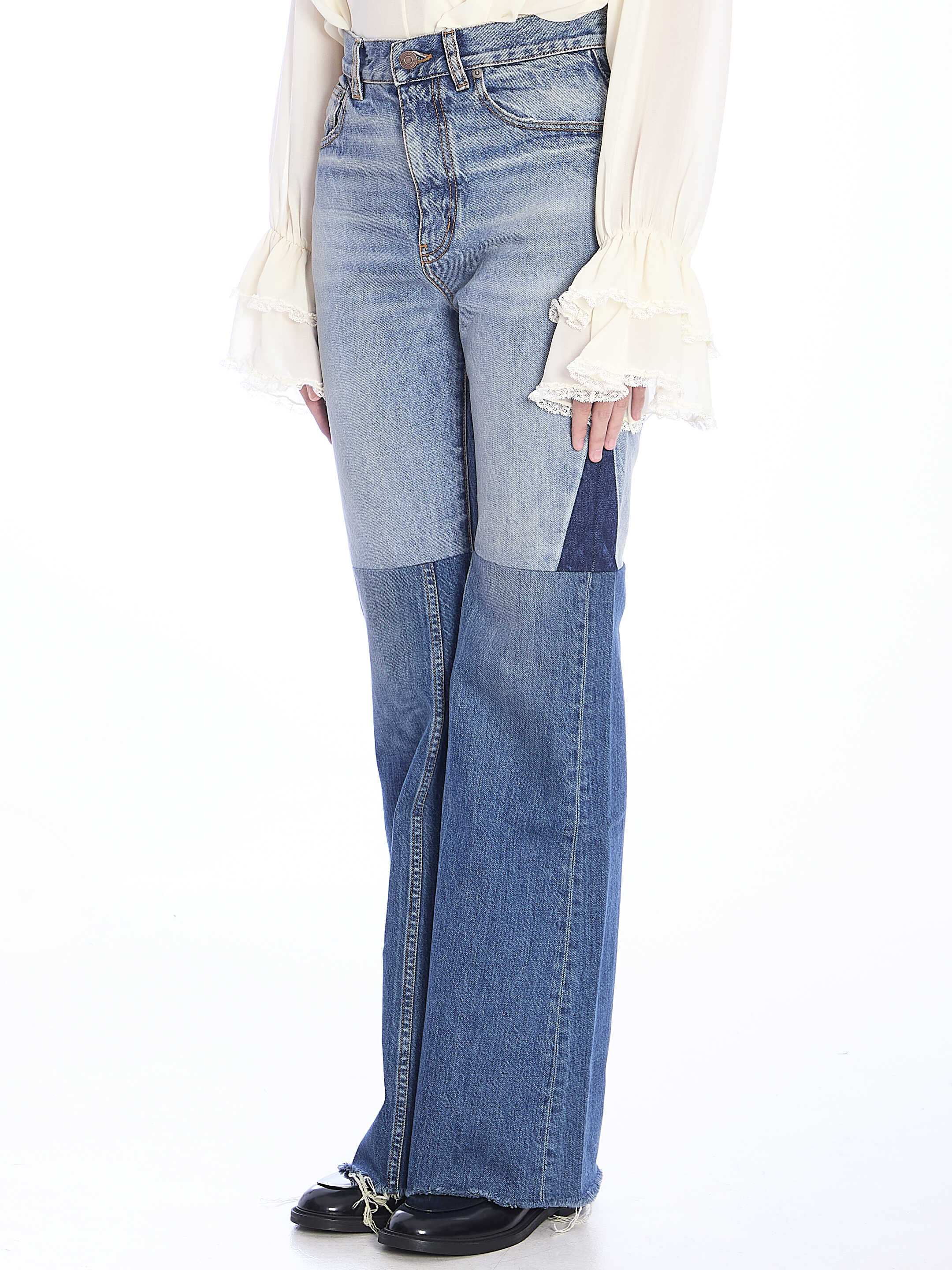 High-waisted flared patchwork jeans in tricolor organic cotton denim. It features zip and button closure, five-pocket design, belt loops, Chloé patch at the back and frayed hem. Regular fit.