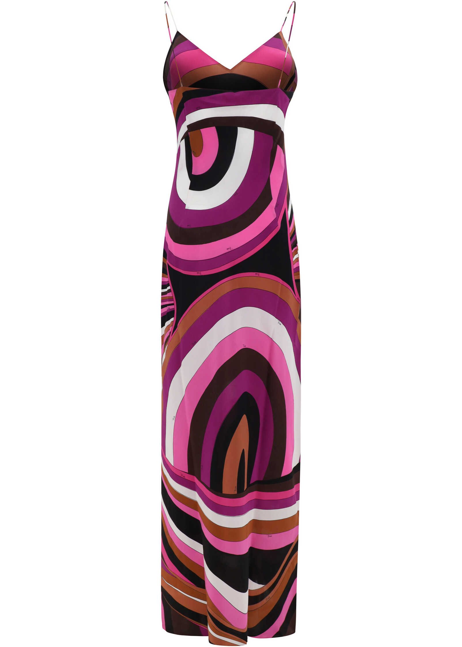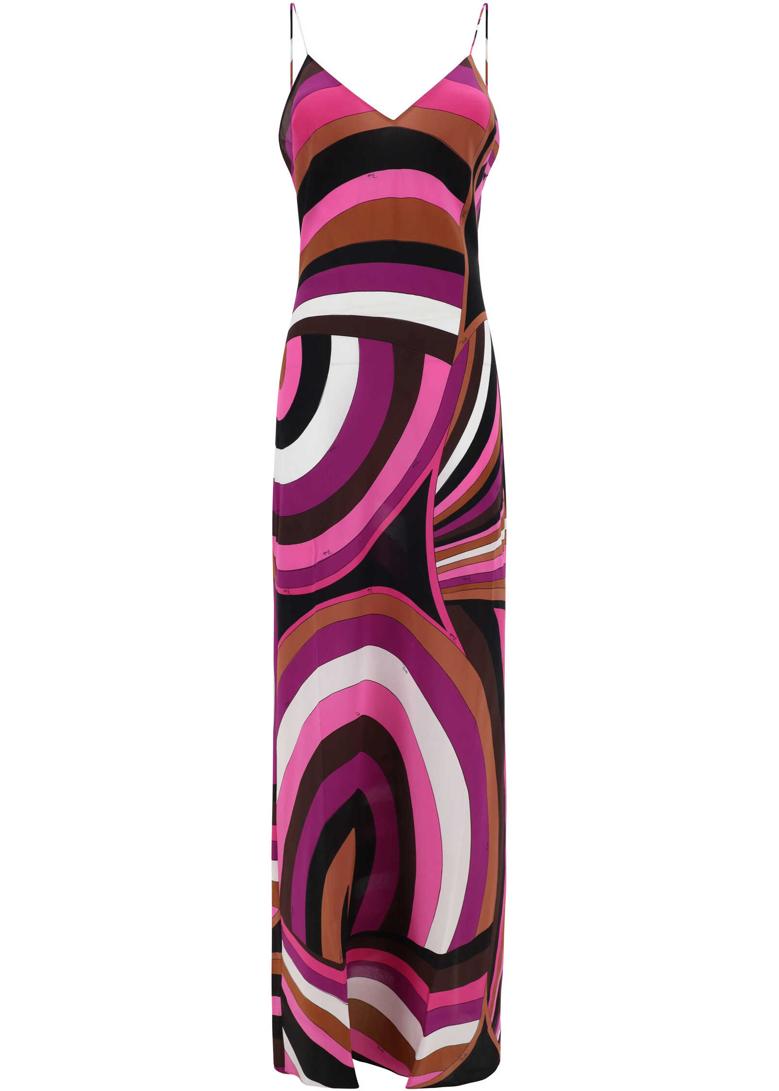 Silk Long Dress by Pucci, sleeveless design, thin straps, V-neck on front, square neckline on back, iconic all-over repeated brand Iride print, deep side slits, slim fit.