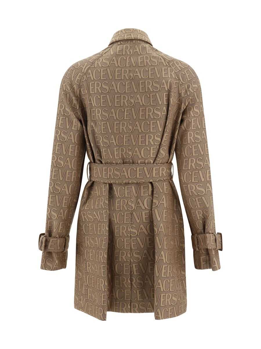 Versace's trench coat crafted in Versace Allover jacquard canvas in the shades of beige. Featuring classic collar with hook-and-eye, button closure, long sleeves with belts at cuffs, removable belt at waist, front pockets and back slit. Unlined interior. Capsule La Vacanza.