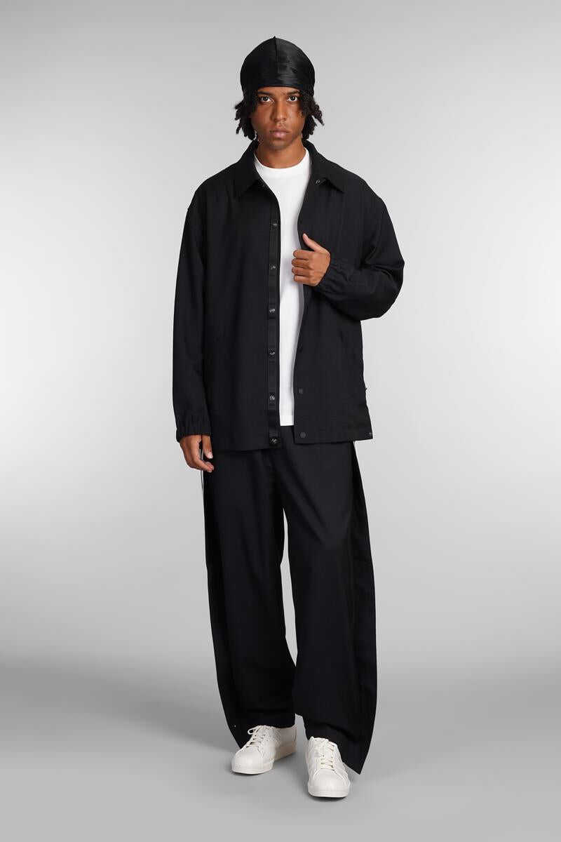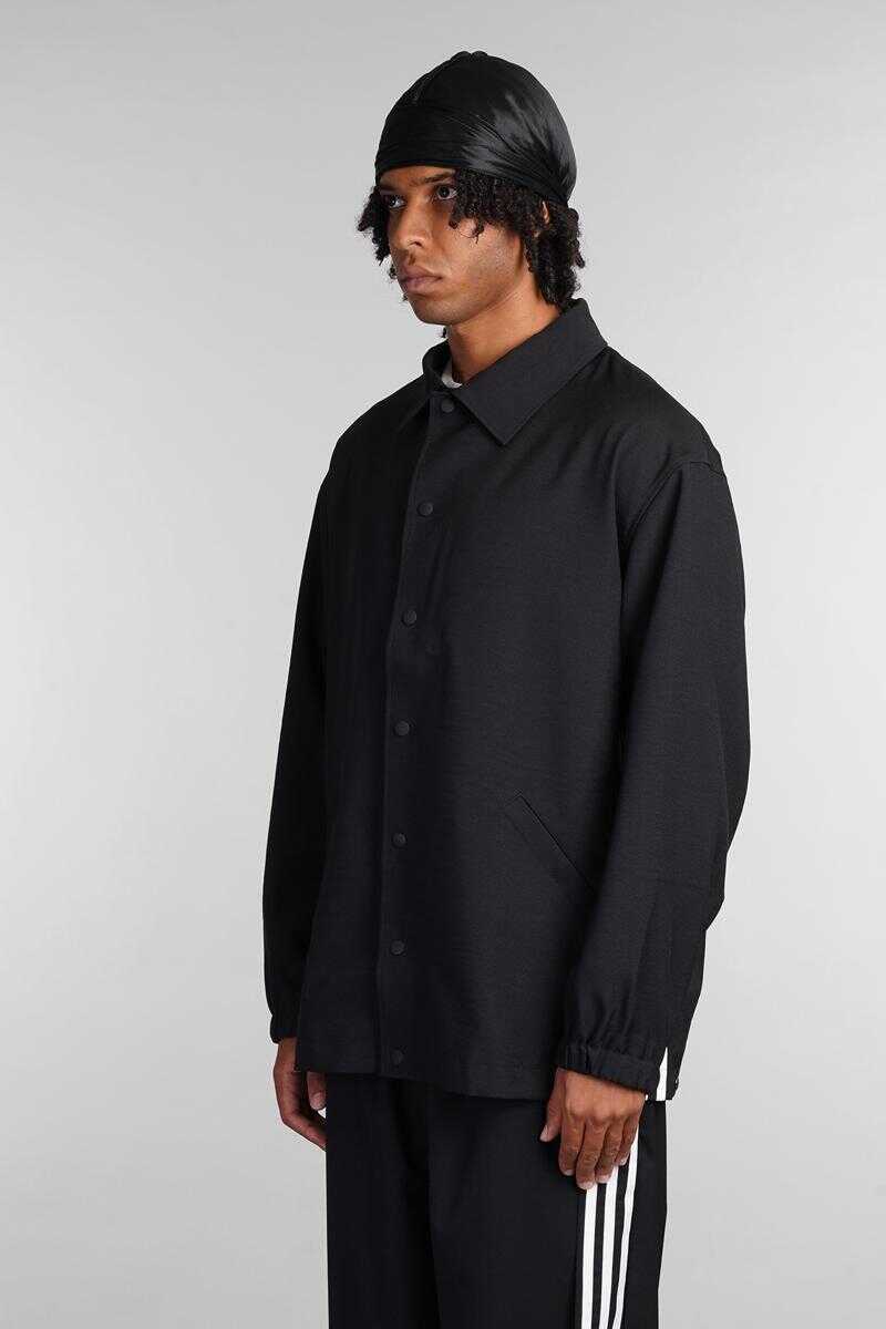 Casual jacket in black polyester, collar, press buttons closure, long sleeves, elastic cuffs, welt pockets, side bands, straight hem, 100% polyester, Made in China