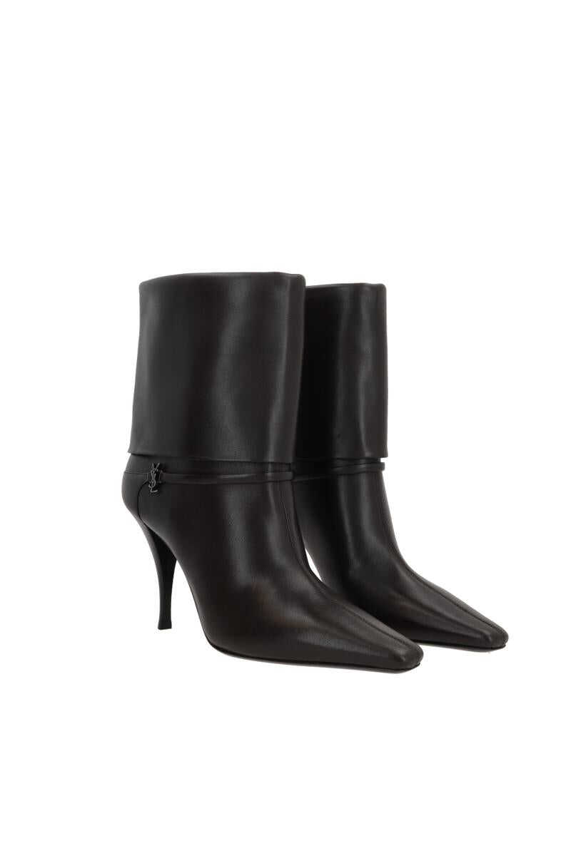 Saint Laurent's pull-on ankle boots crafted in black nappa with front decorative strap embellished by the iconic metal Cassandre logo. Featuring a point-toe silhouette, leather lining and leather sole. The design is completed by a wooden stiletto heel.