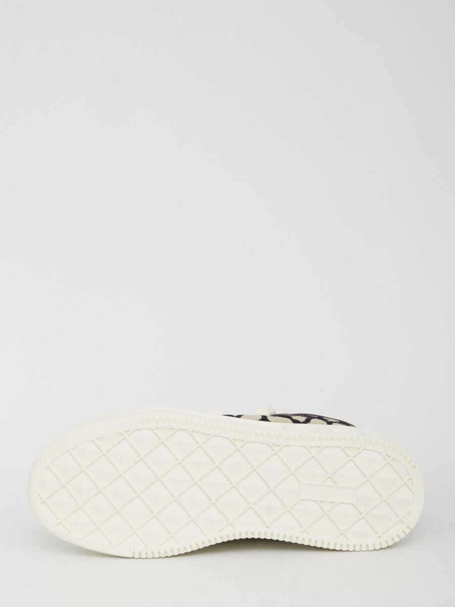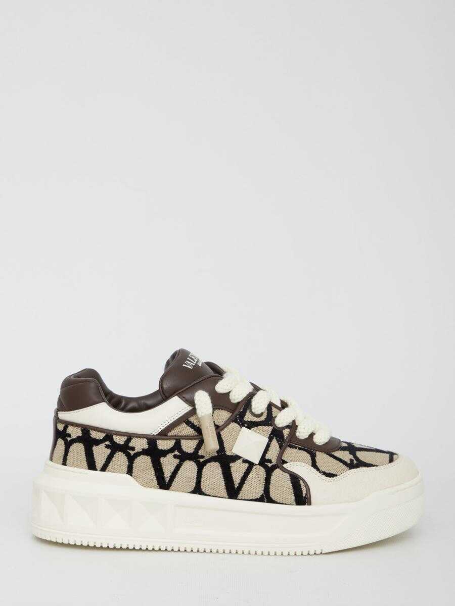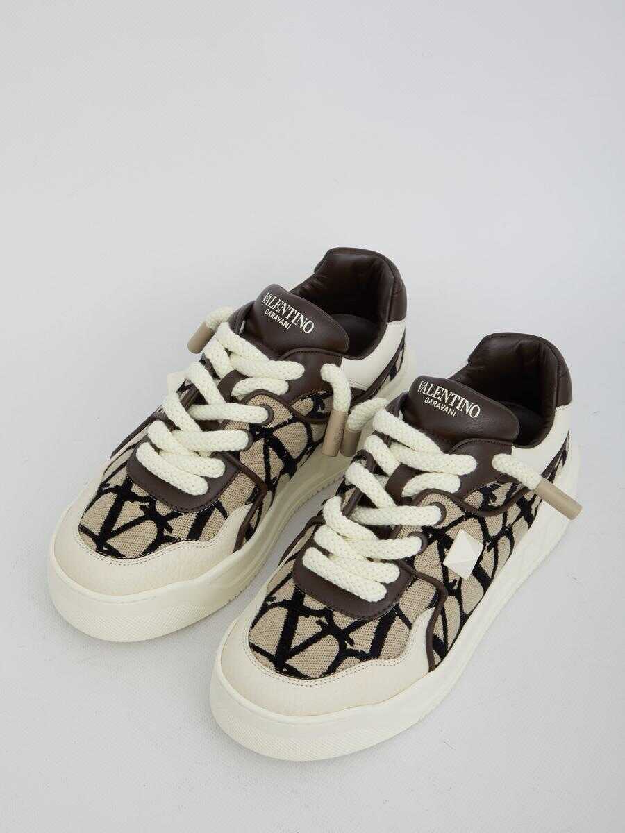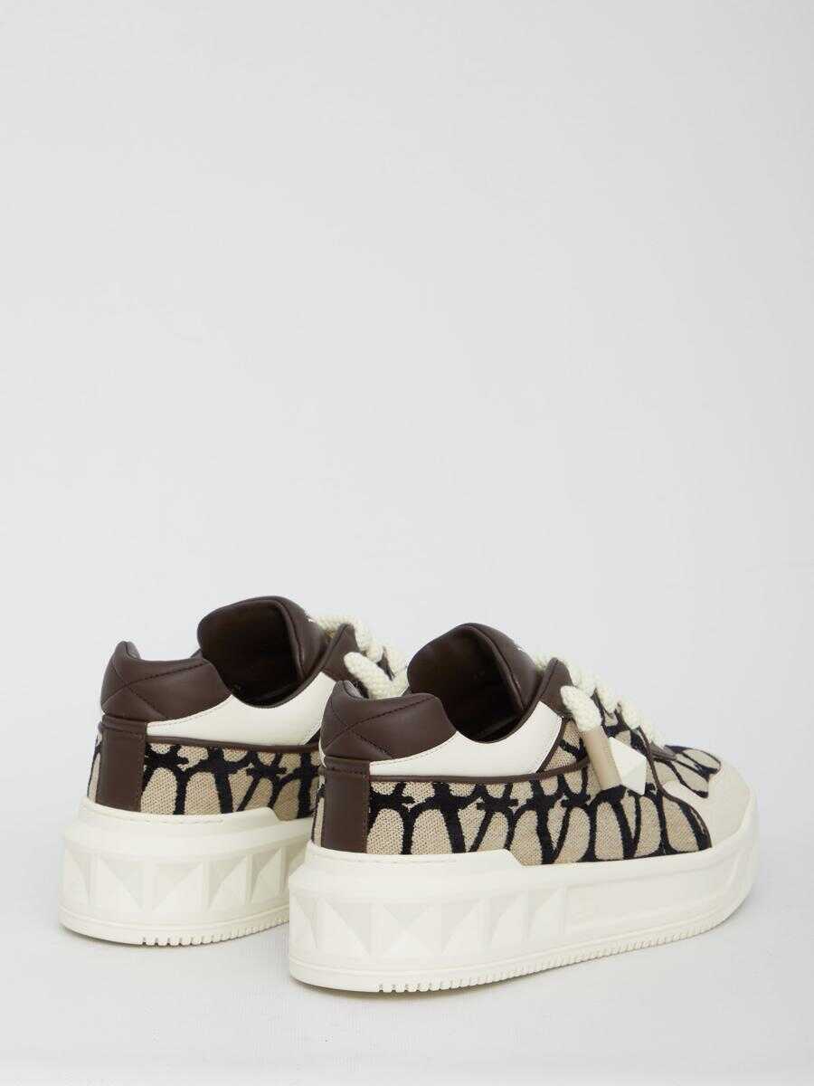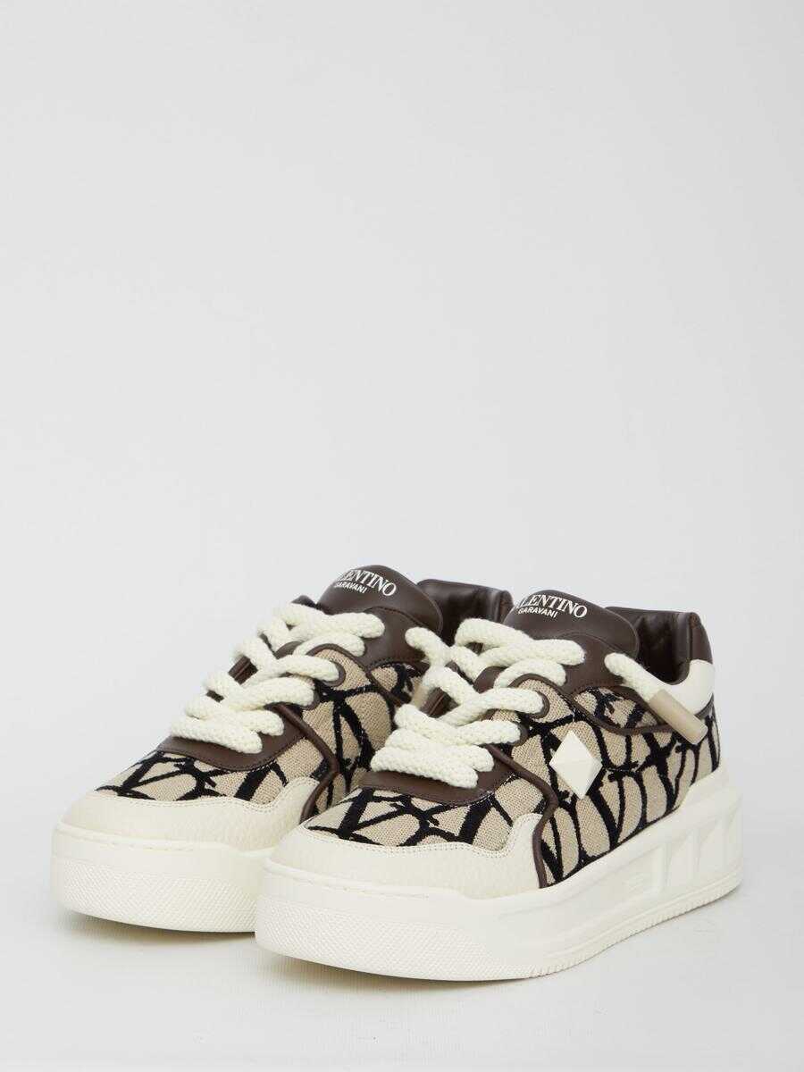 Valentino Garavani Low-Top One Stud XL sneakers in Toile Iconographe and leather with side Maxi stud detail. Lace-up closure and flarform rubber sole with embossed Maxi stud detailing. Dust bag included.