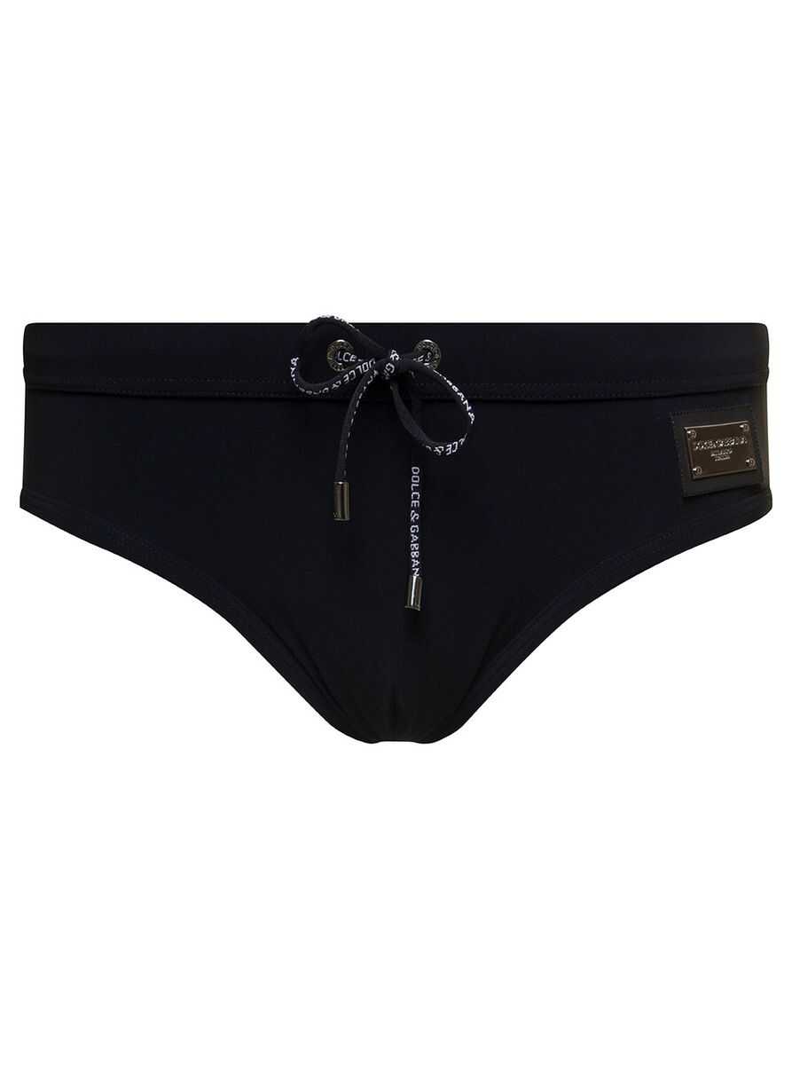 Black swim trunks from Dolce & Gabbana featuring stretch-design, logo patch to the front, elasticated drawstring waistband and removable pouch. Be mindful to try on swimwear over your own garments..