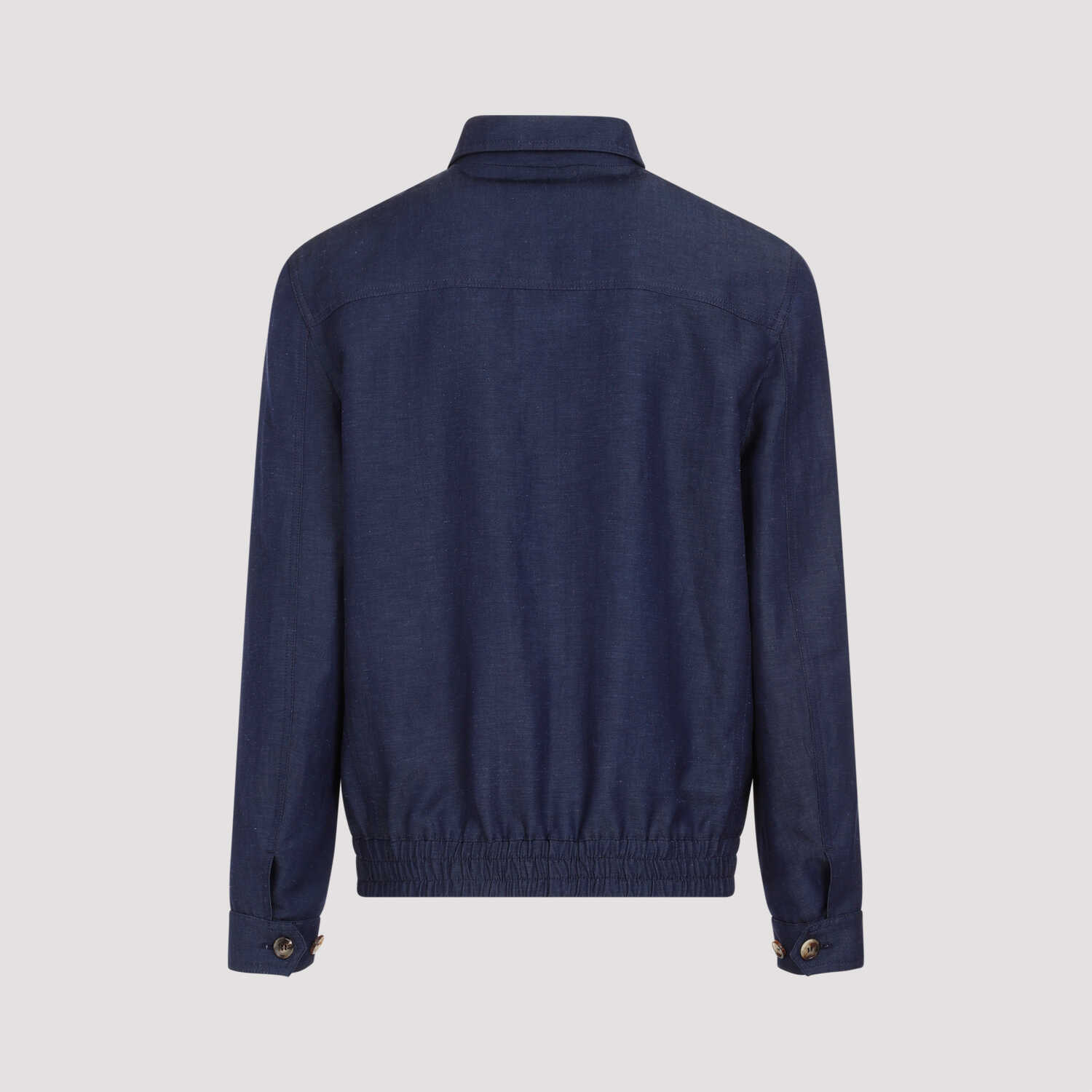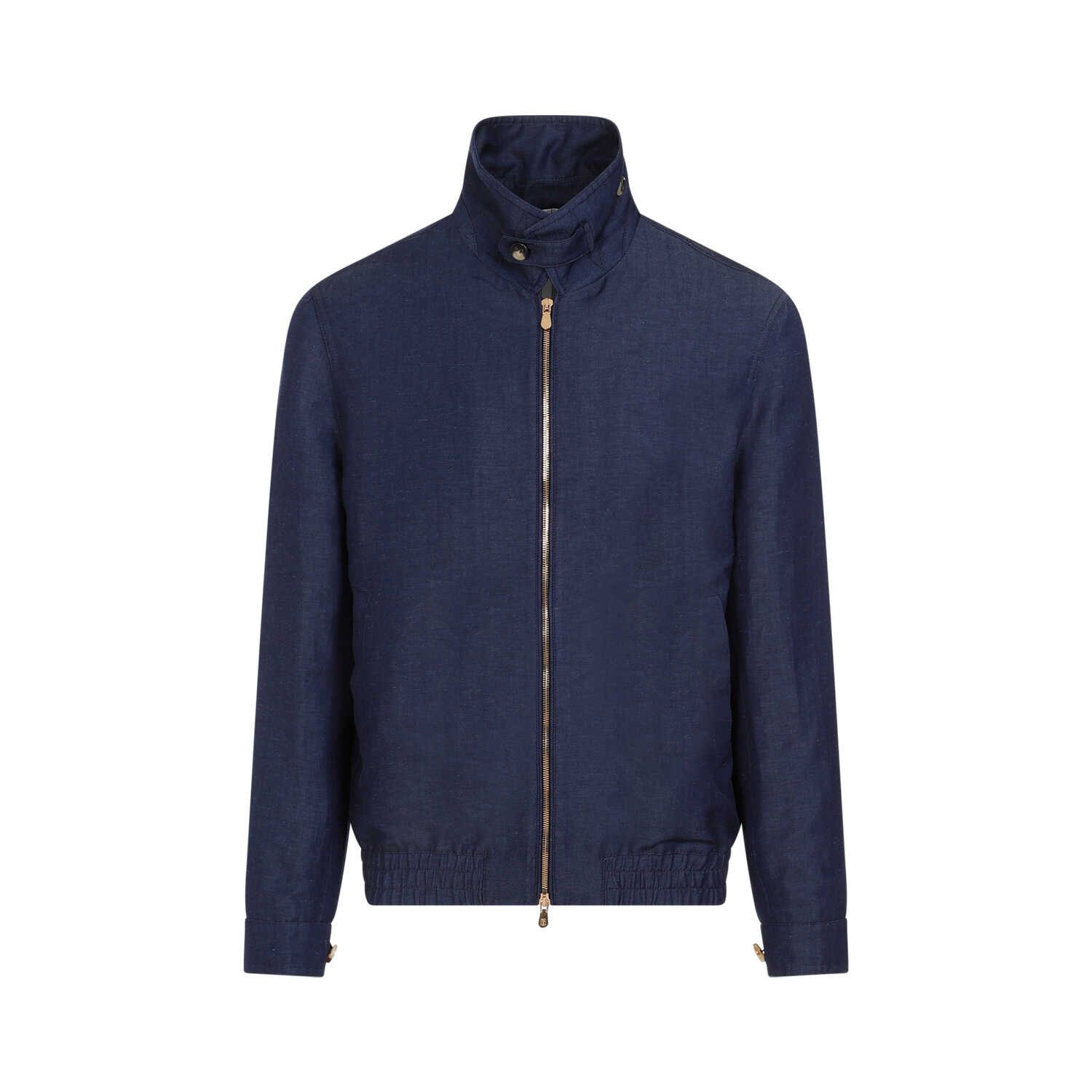 Brunello Cucinelli Denim Blue Wool Outerwear. Crafted in wool and linen blend. Stand-up buttoned collar, front zipped fastening, side slit pockets, long sleeves, buttoned cuffs, elasticated and straight hem, fully lining.