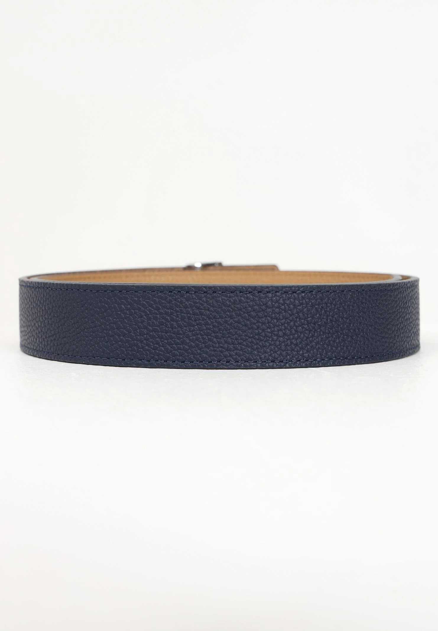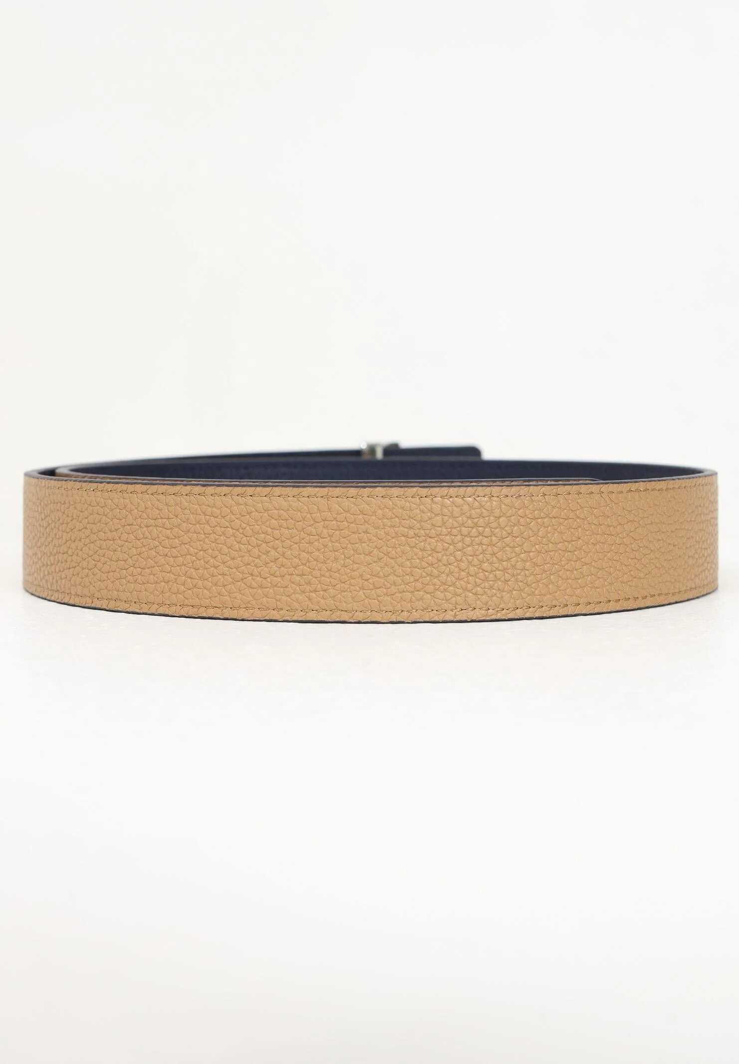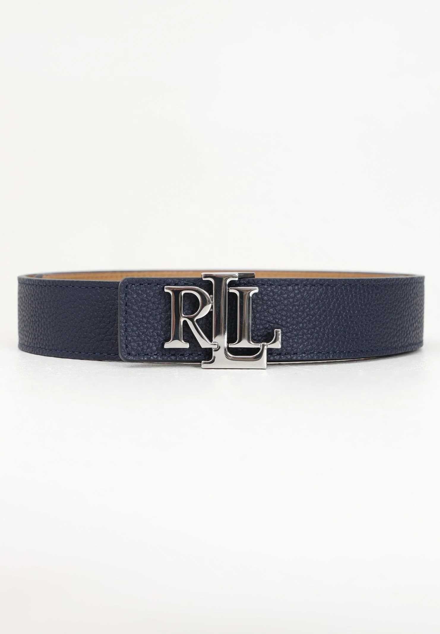 `LAUREN RALPH LAUREN reversible blue and beige women`s belt with LRL logo plaque, featuring hammered detailing.`