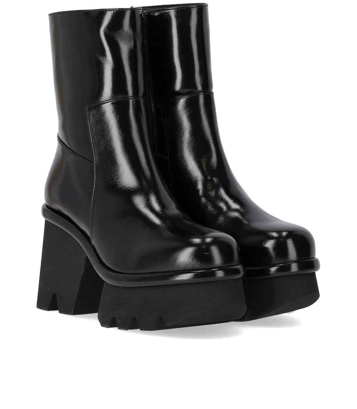 Hanne ankle boot by Paloma Barceló made of black nappa leather with a glossy finish. Zip closure on the inner side and leather lining, maxi rubber sole in black. Heel height 8 cm with a 3.5 cm platform.