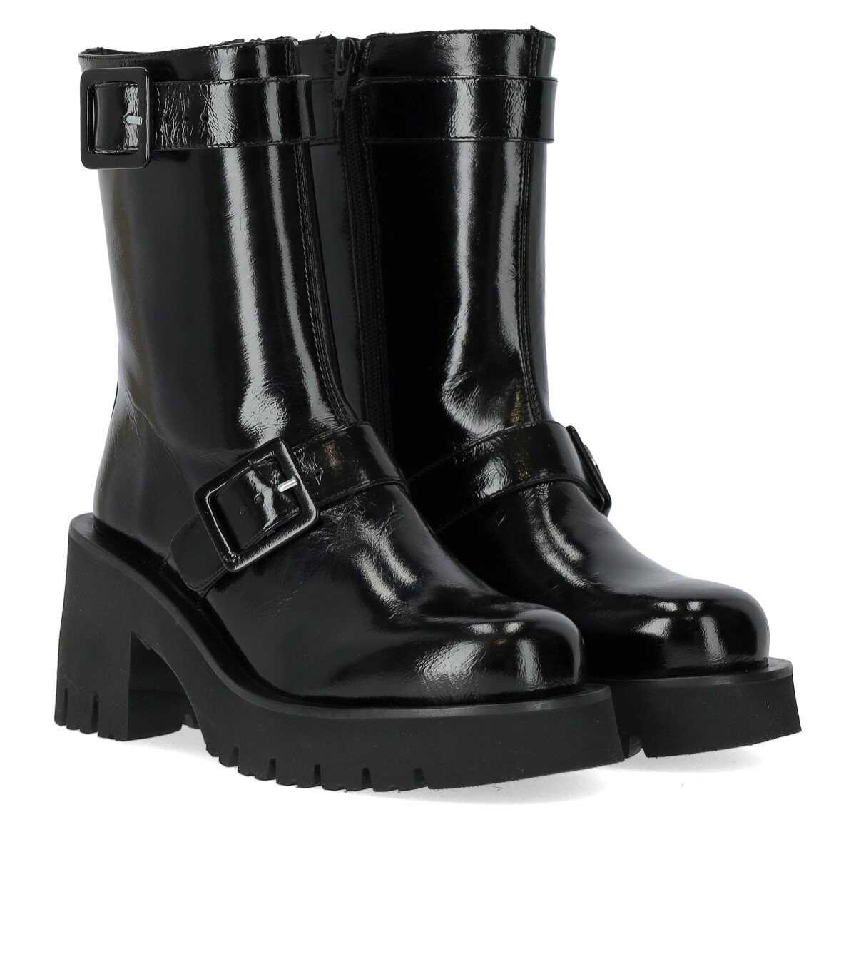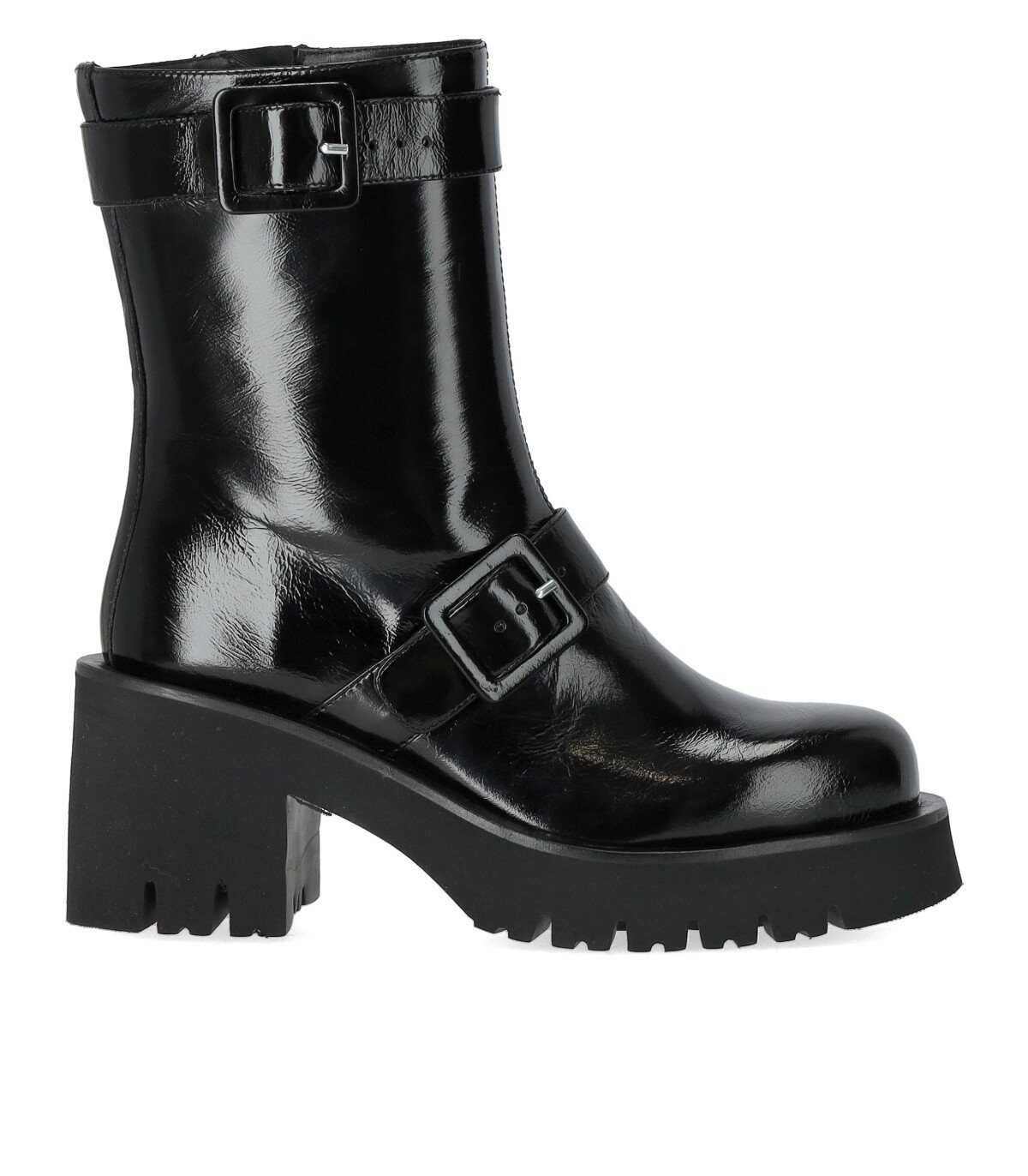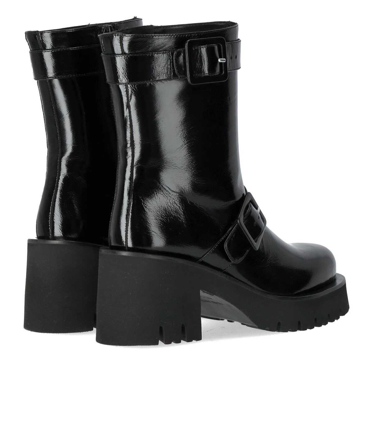 Lulu ankle boot by Paloma Barceló made of black patent leather, featuring adjustable straps and a zip closure on the inner side. Leather interior, black rubber sole. Heel height 7.5 cm with a 3 cm platform.