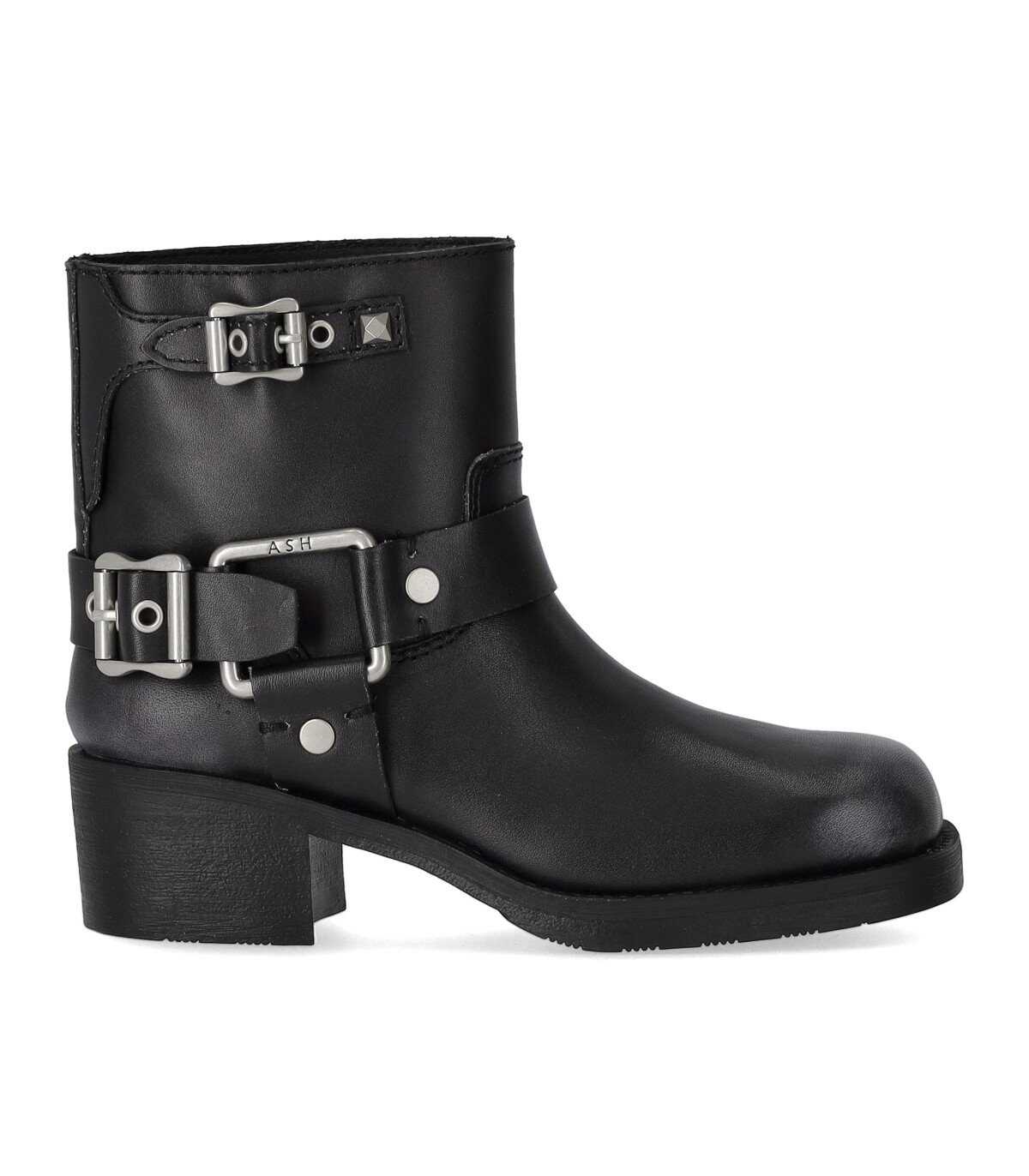 Texas ankle boot by Ash made of black leather. Square toe with a slight vintage effect, straps with buckles on the side, and black rubber sole. Leather interior, heel height 5 cm.
