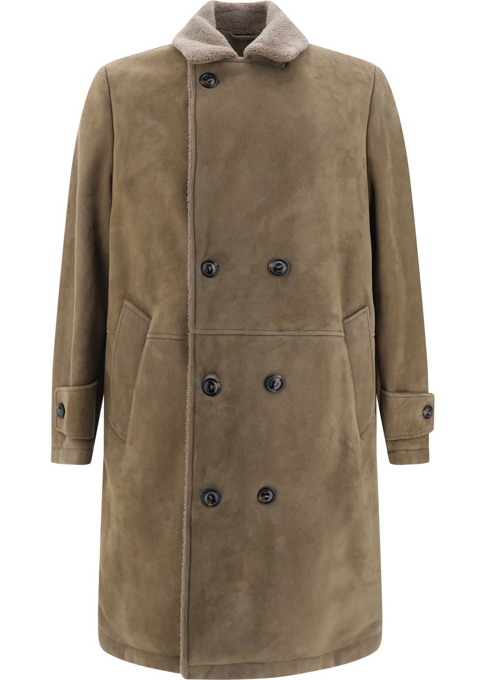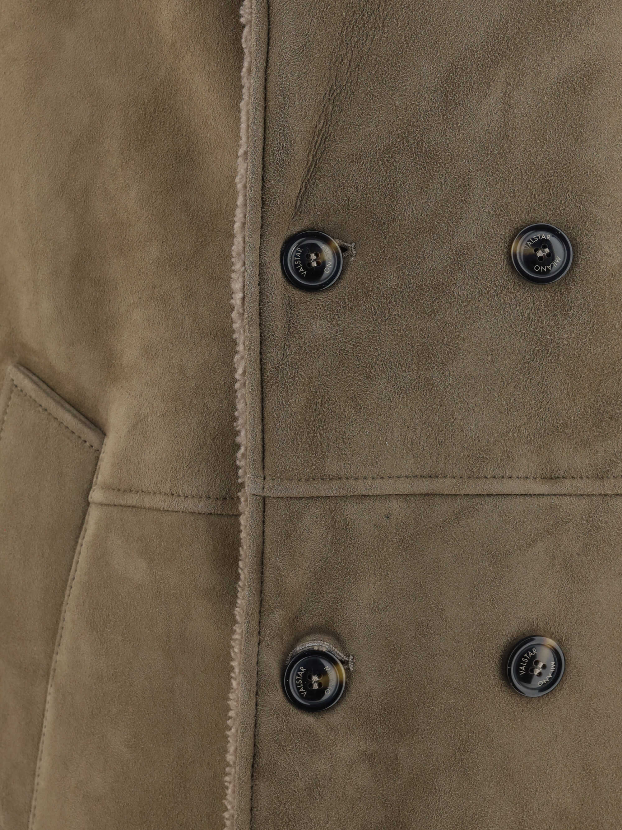 Lambskin Charles Coat, classic lapels, double-breasted button closure, two side welt pockets, back slit, suede design, shearling lining, regular fit.