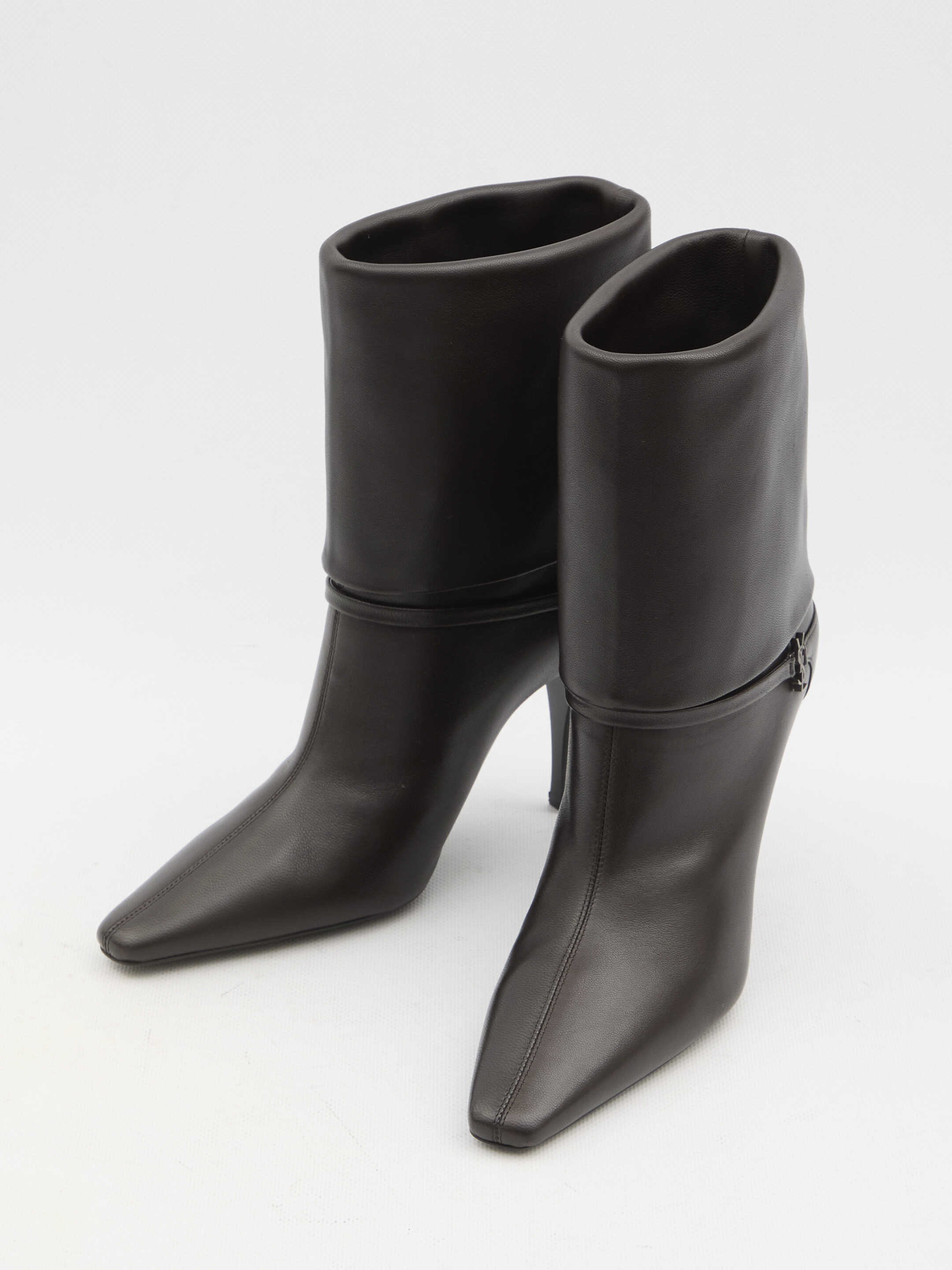 Niki boots in brown smooth lambskin with turn-up and ankle strap embellished with Cassandre. They feature pointed toe, stiletto heel and leather sole. Dust bag included. Any leather imperfections are not to be considered manufacturing defects, but a peculiarity of the material.