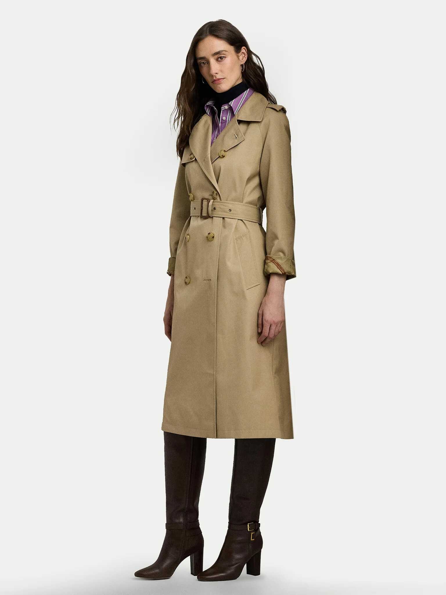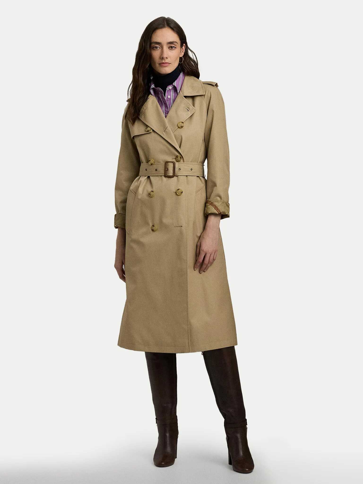 The LAUREN RALPH LAUREN double-breasted cotton trench coat features an unlined collar, side pockets, waist belt, shoulder strap closure system, belt loops, and button closure.