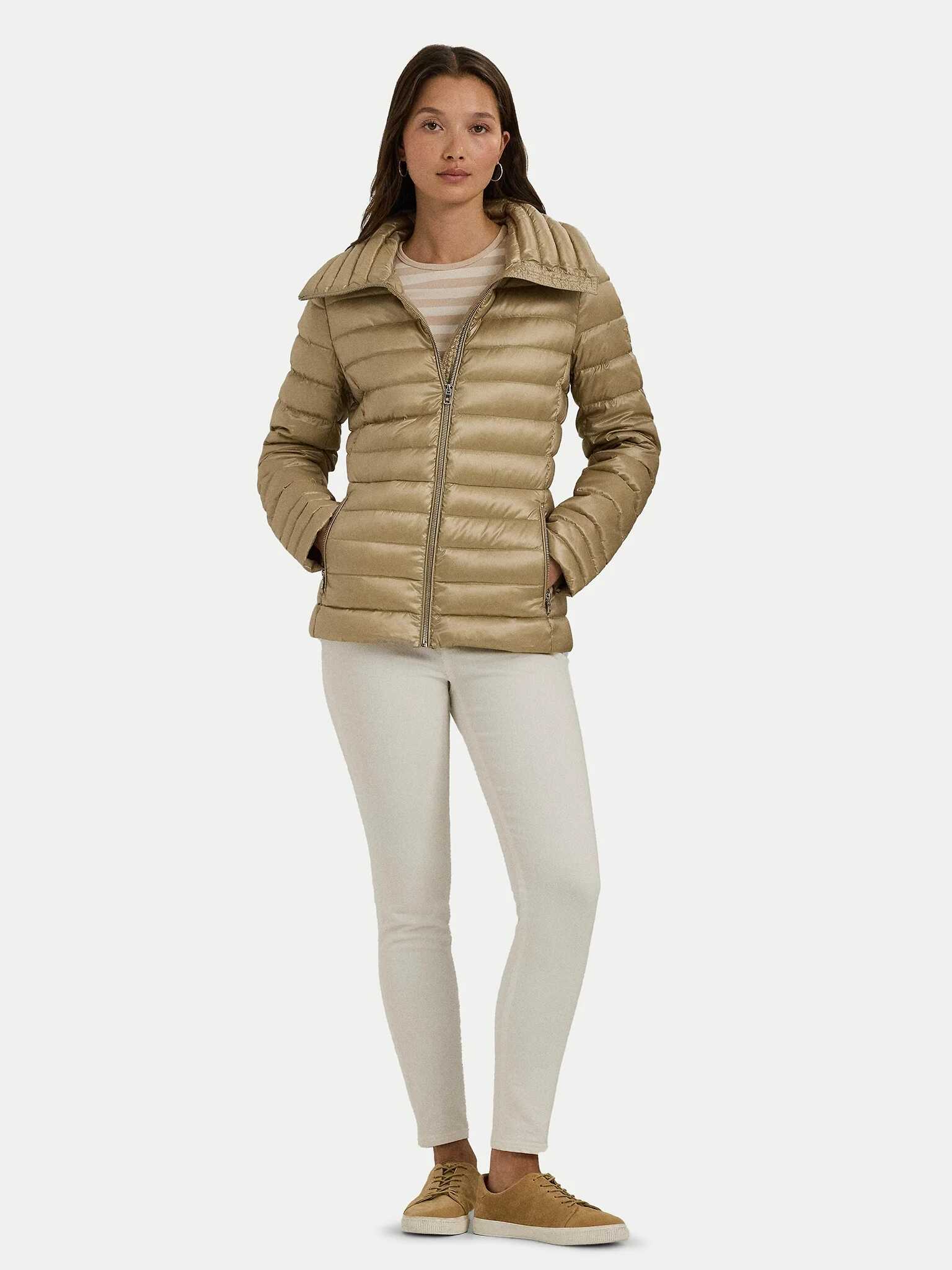 The LAUREN RALPH LAUREN down jacket, with zip closure, high collar, and side zip pockets.