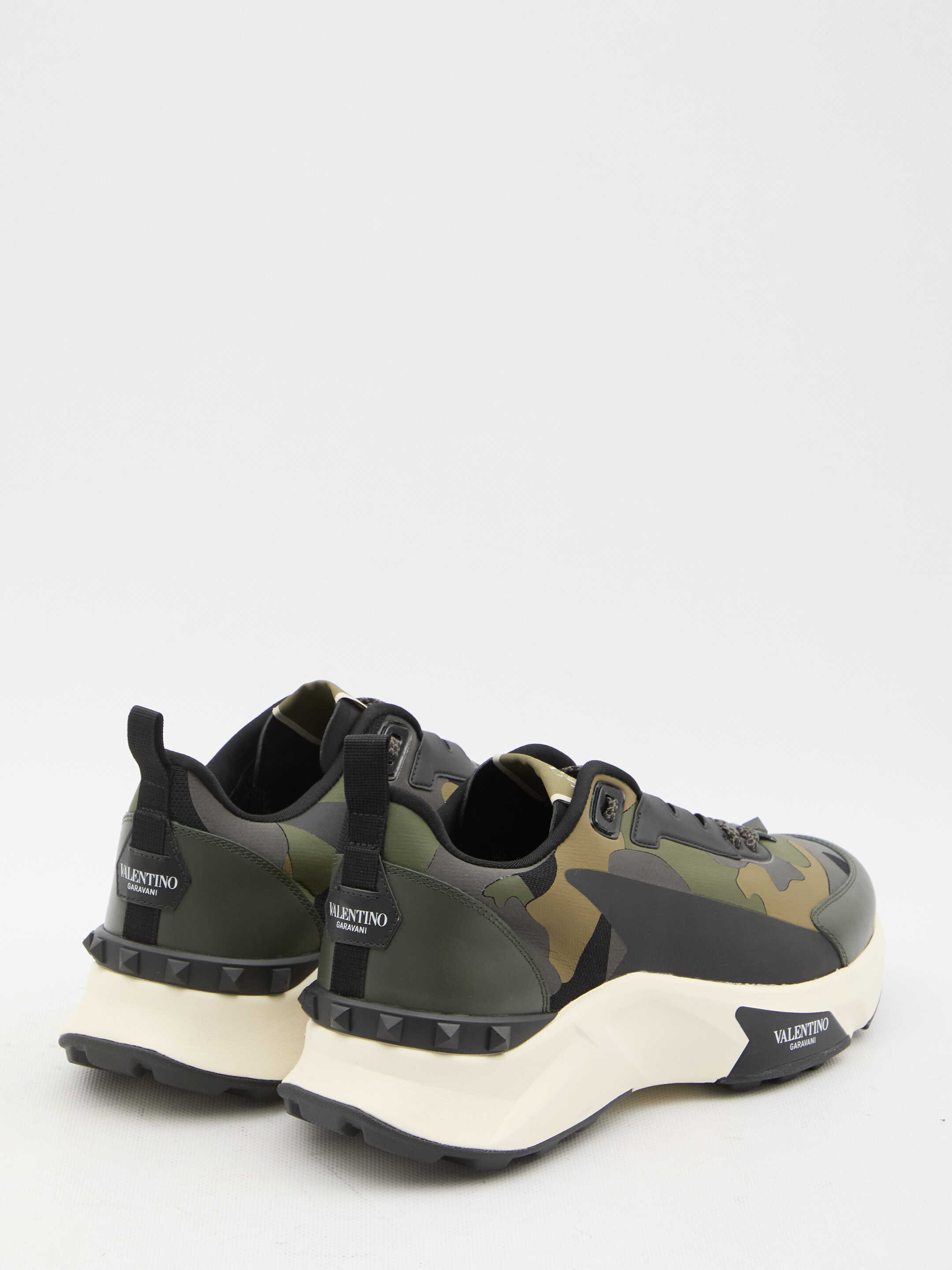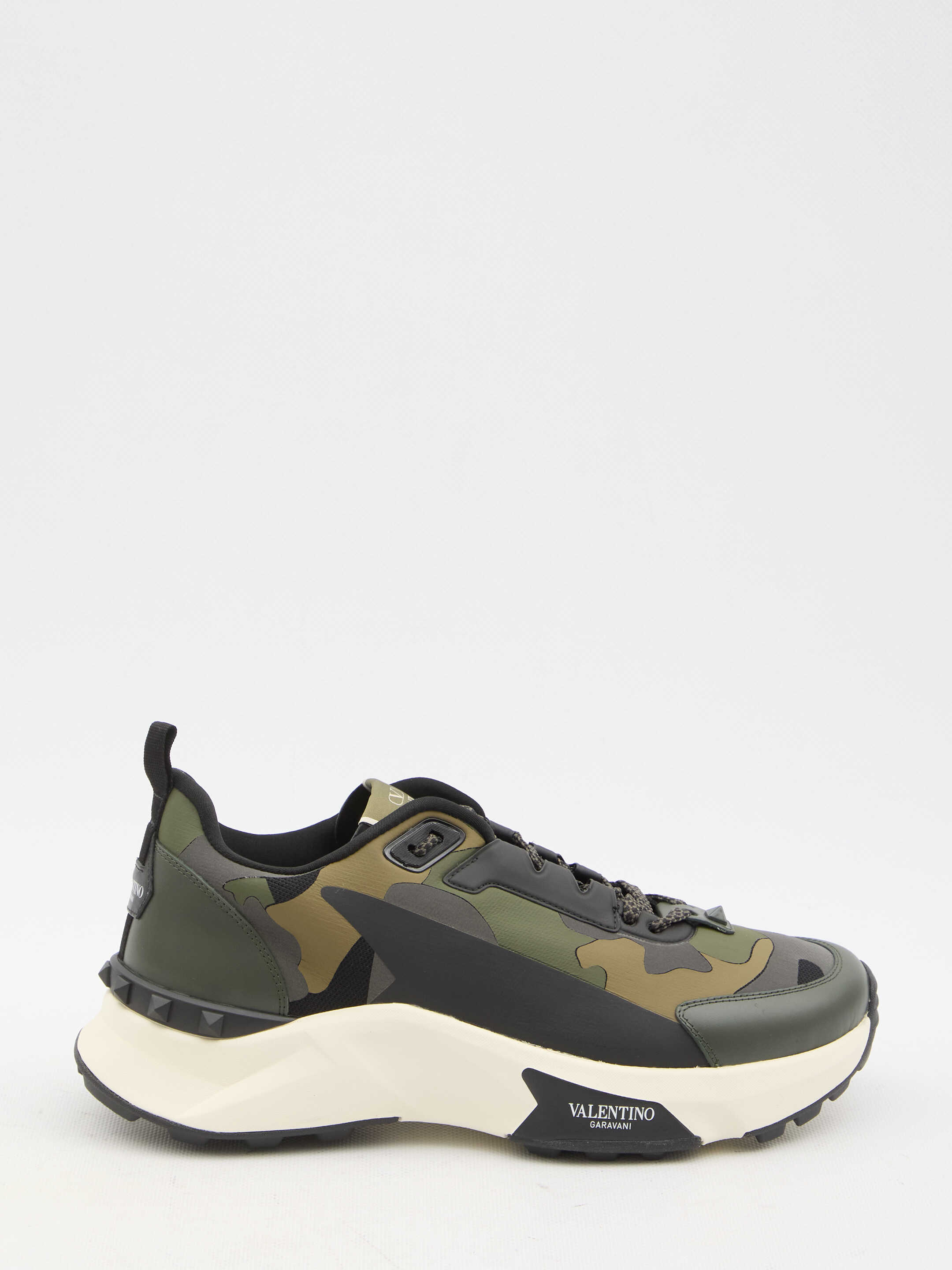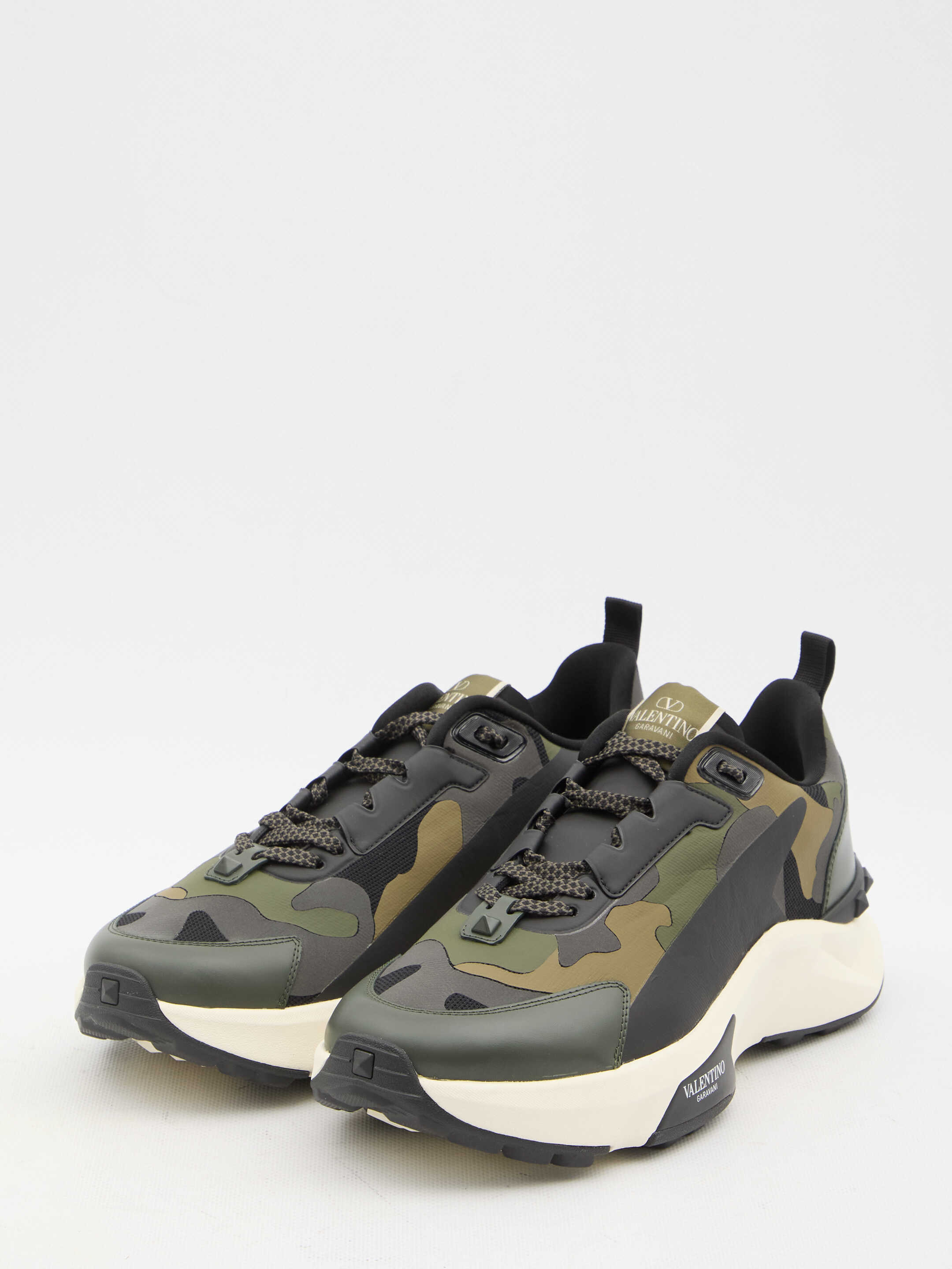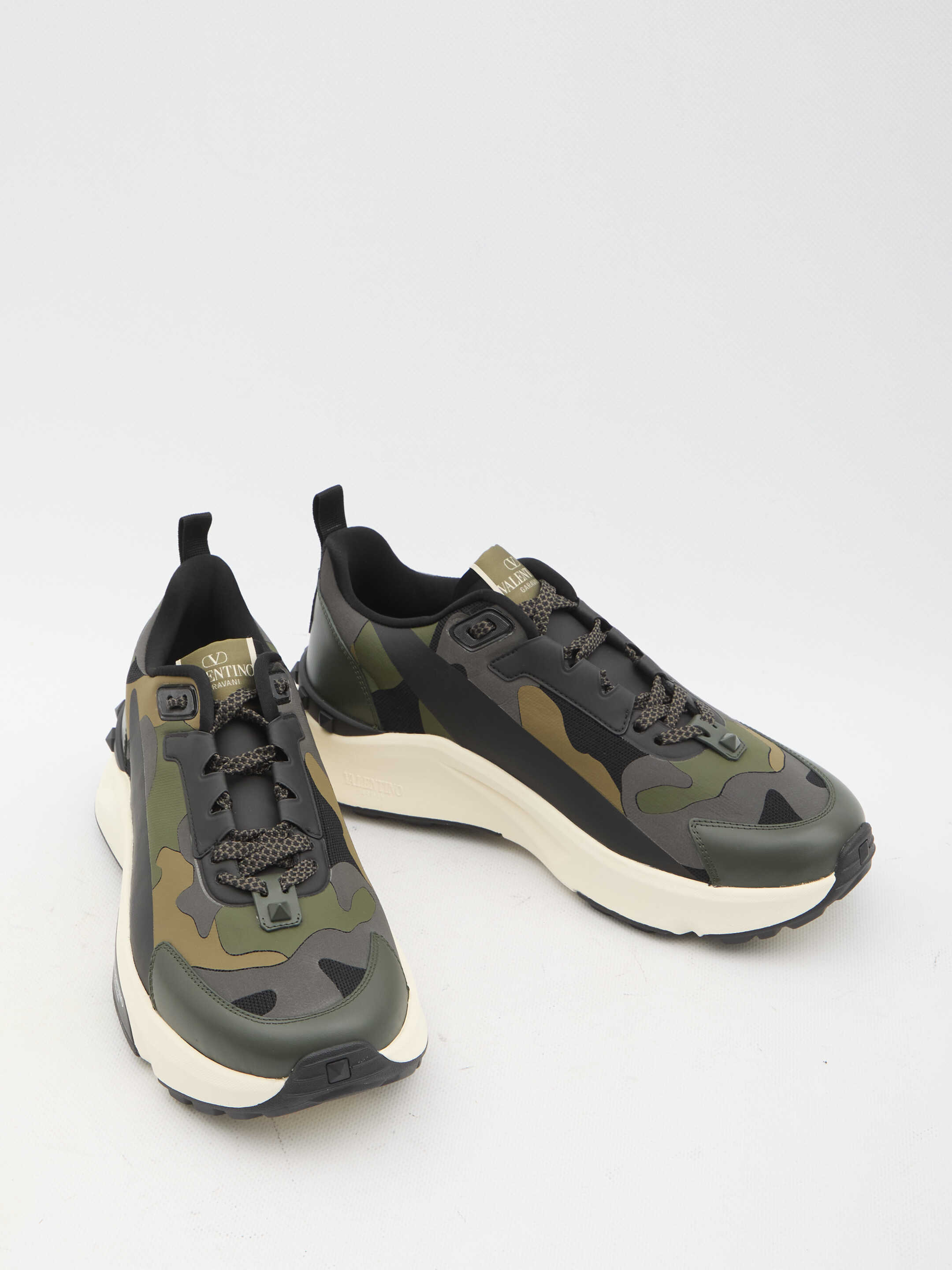 Valentino Garavani Low Top True Act Camouflage sneakers in rubberized fabric. They feature lace-up closure, Valentino Garavani logo on tongue and rubber sole with studs detailing and Valentino Garavani logo on the side. Dust bag included. Additional laces included.