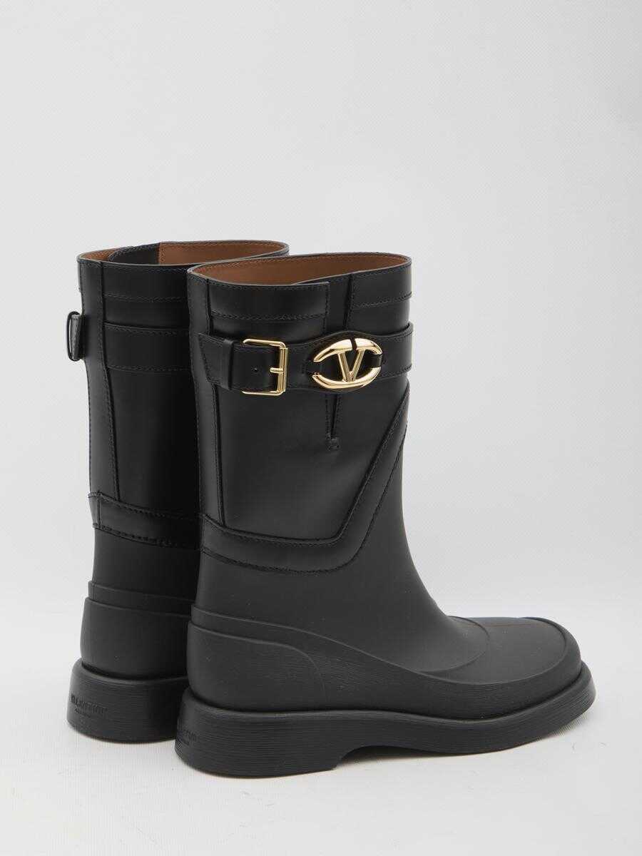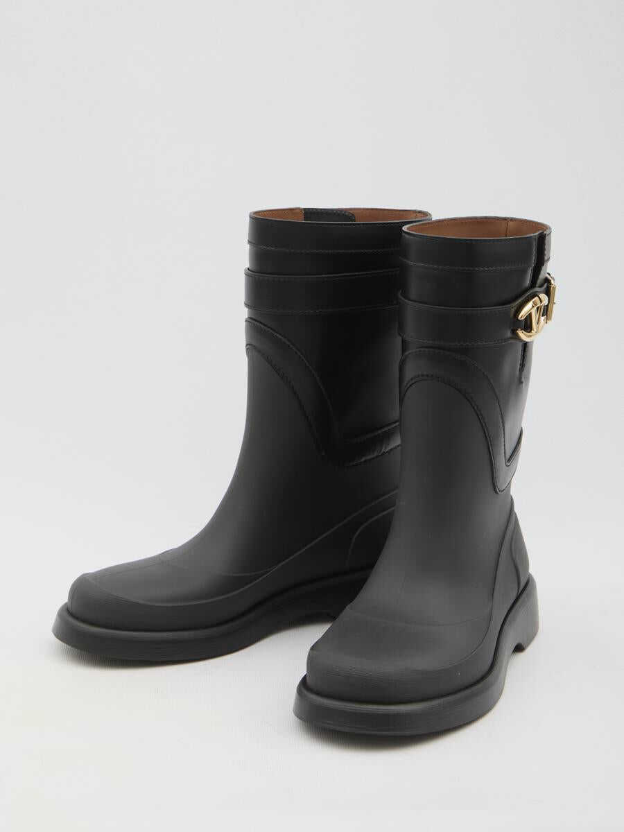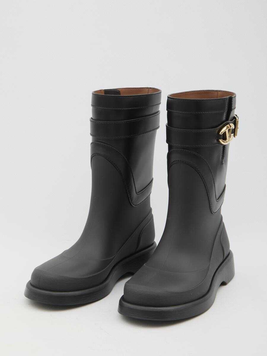 Valentino Garavani VLogo The Bold Edition rainboots in black rubber with calfskin shaft. They feature strap with VLogo Signature detail and buckle in gold-tone metal and rubber sole. Dust bag included. Any leather imperfections are not to be considered manufacturing defects, but a peculiarity of the material.