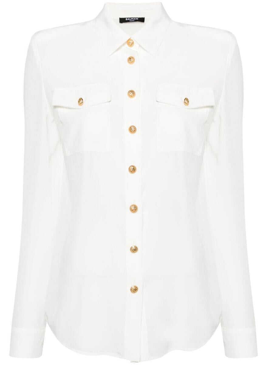 white silk semi-sheer construction embossed gold-tone buttons pointed flat collar front button fastening shoulder pads long sleeves buttoned cuffs two chest flap pockets curved hem