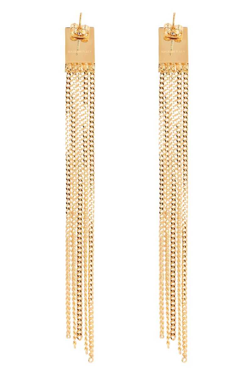 Gold-tone polished finish dangle design enamel logo studs chain-link fringes post-back fastening for pierced ears these earrings come as a pair.
