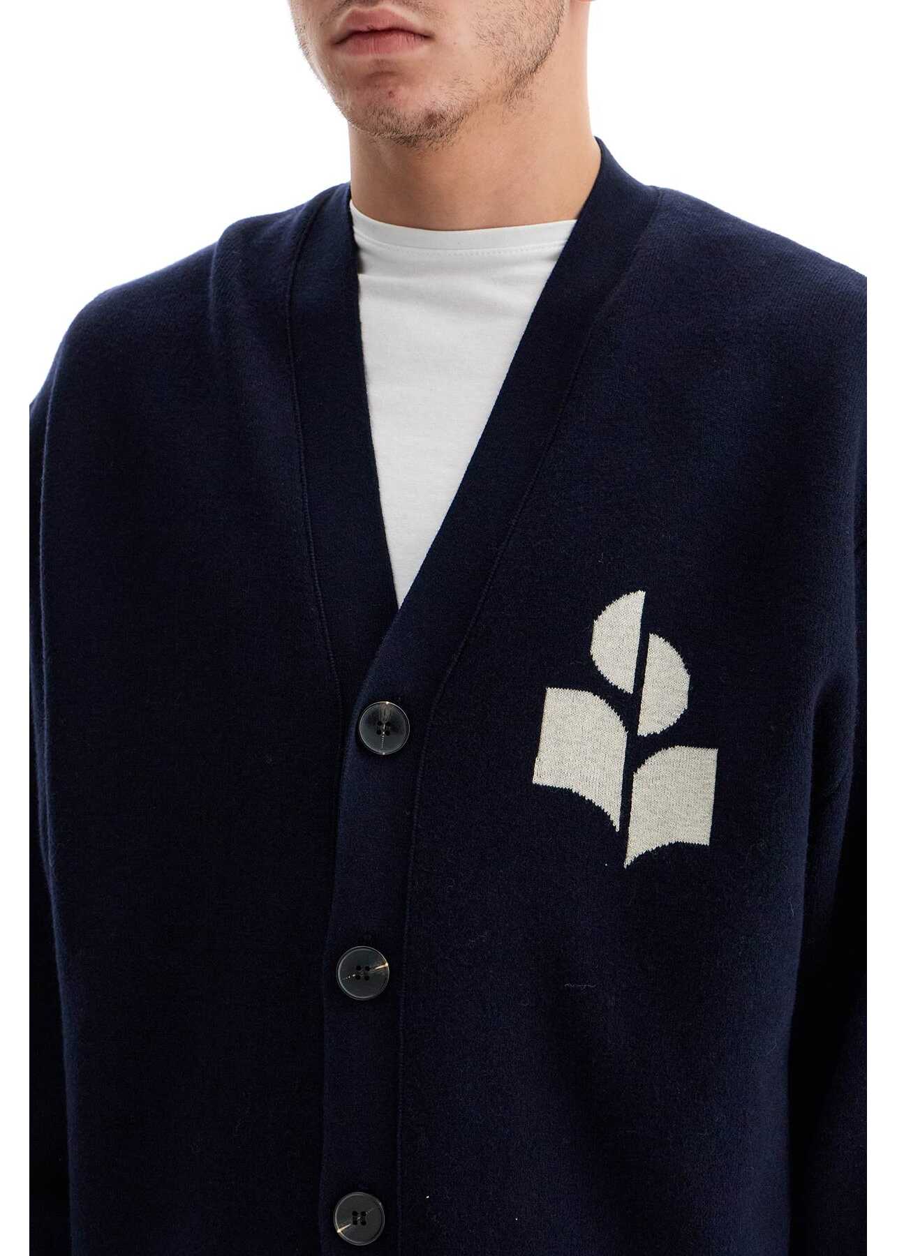 This oversized Marant cardigan is made of organic cotton and wool, featuring an intarsia logo on the chest. It has a V-neckline, button closure, and ribbed edges. The model is 182 cm tall and wears size L.