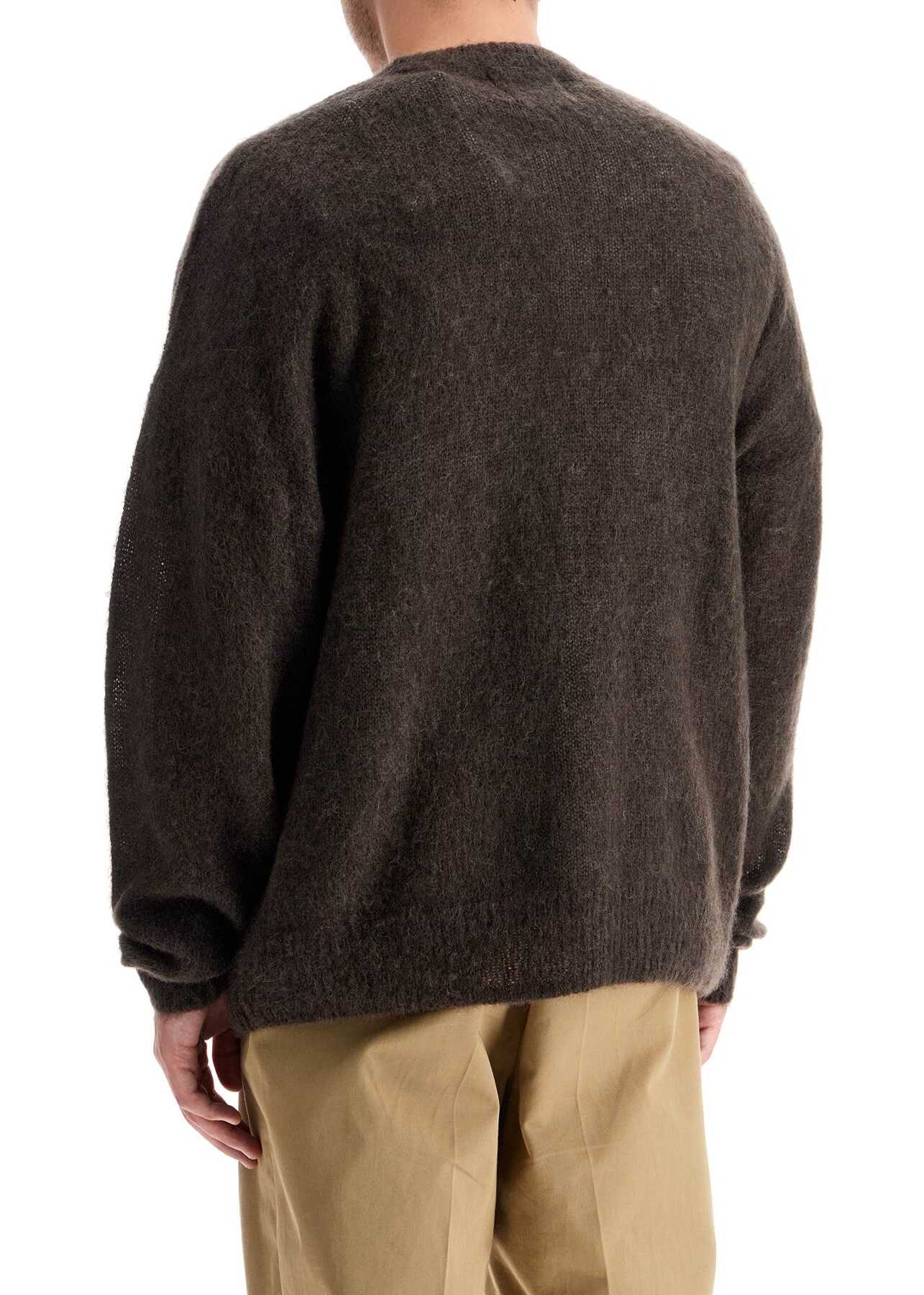 This Marant crew neck pullover is made of a blend of wool and mohair, featuring an intarsia logo on the chest. It has an oversized fit with ribbed edges. The model is 182 cm tall and wears size L.