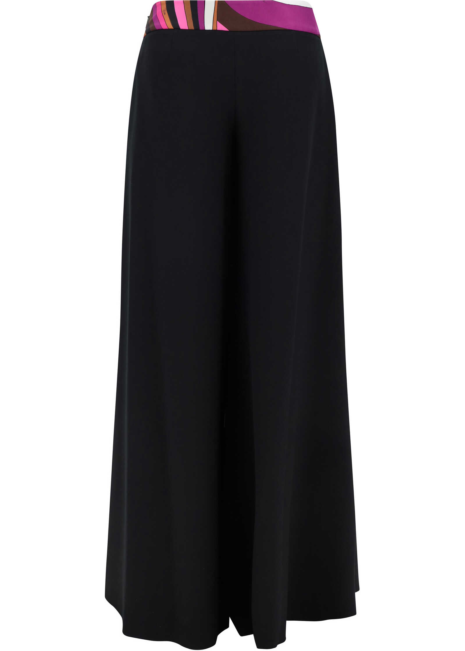 Palazzo pants by Gucci, wide-leg style with mid-rise waist, concealed zipper closure on side panel, side welt pockets, contrasting bands on side panels and waistband with iconic Iris pattern, loose fit.