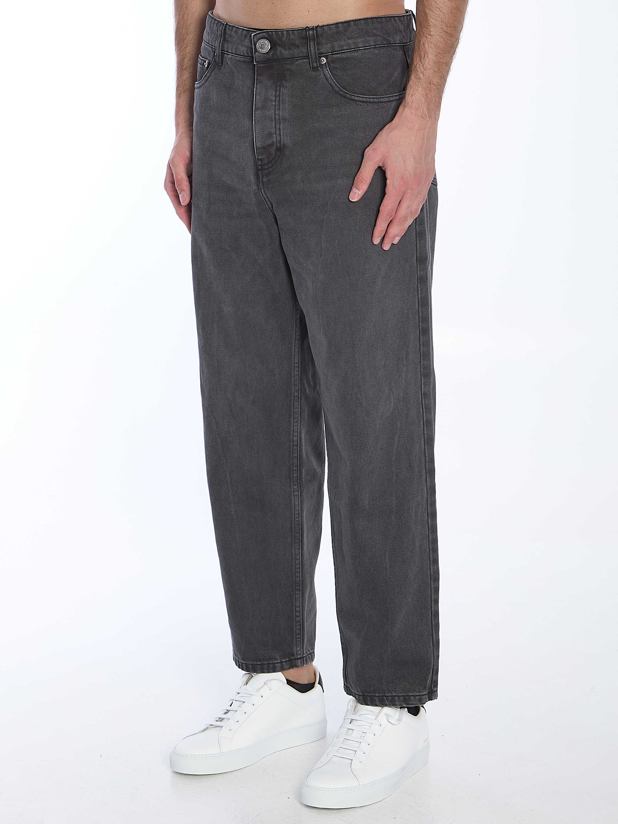 Tapered jeans in délavé black cotton denim. It features button closure, five-pocket design, belt loops and rear patch. Regular fit.