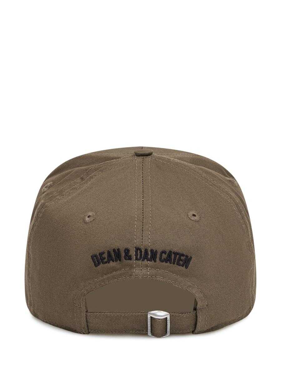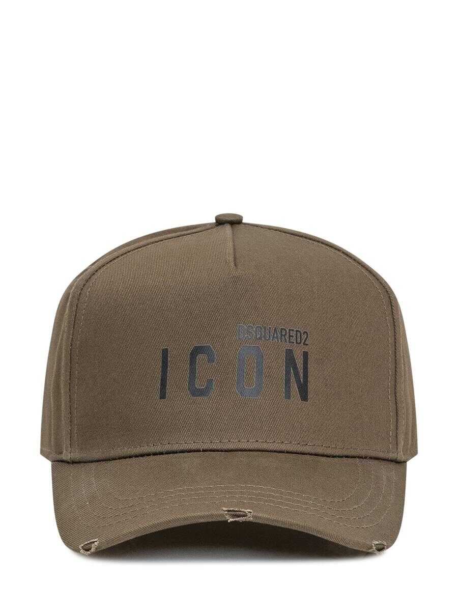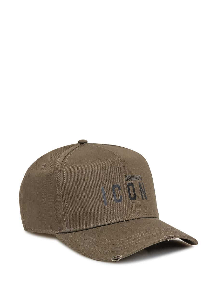 Green cotton hat with visor. Adjustable logo strap at back. Icon logo printed on front. Embroidery on the back. Worn effect.