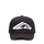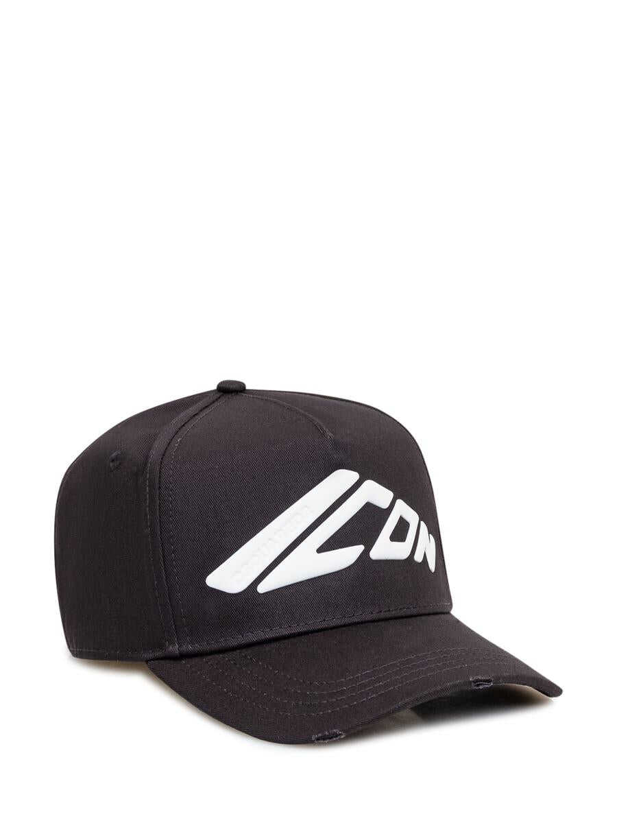 Black cotton hat with visor. Adjustable logo strap at back. Embossed Icon logo on front. Embroidery on the back. Worn effect.